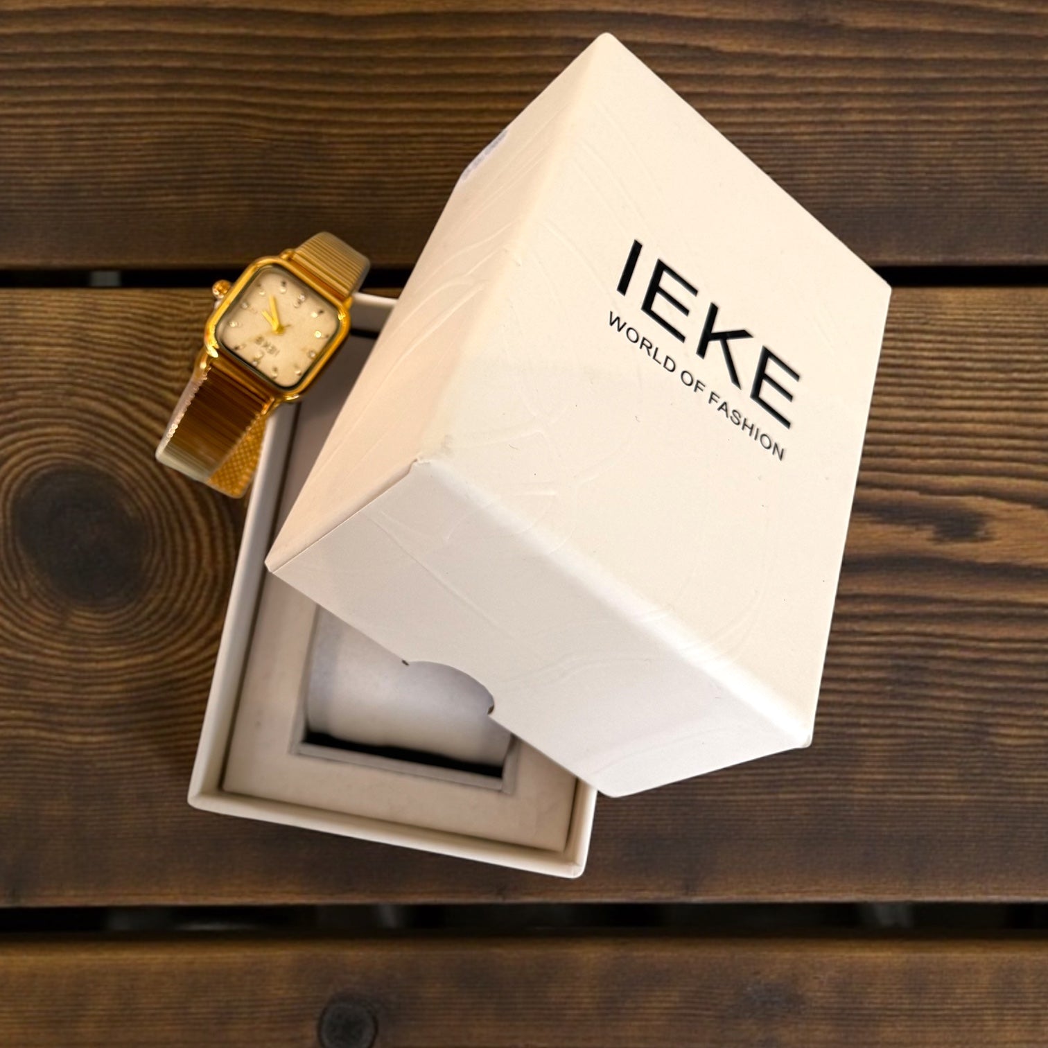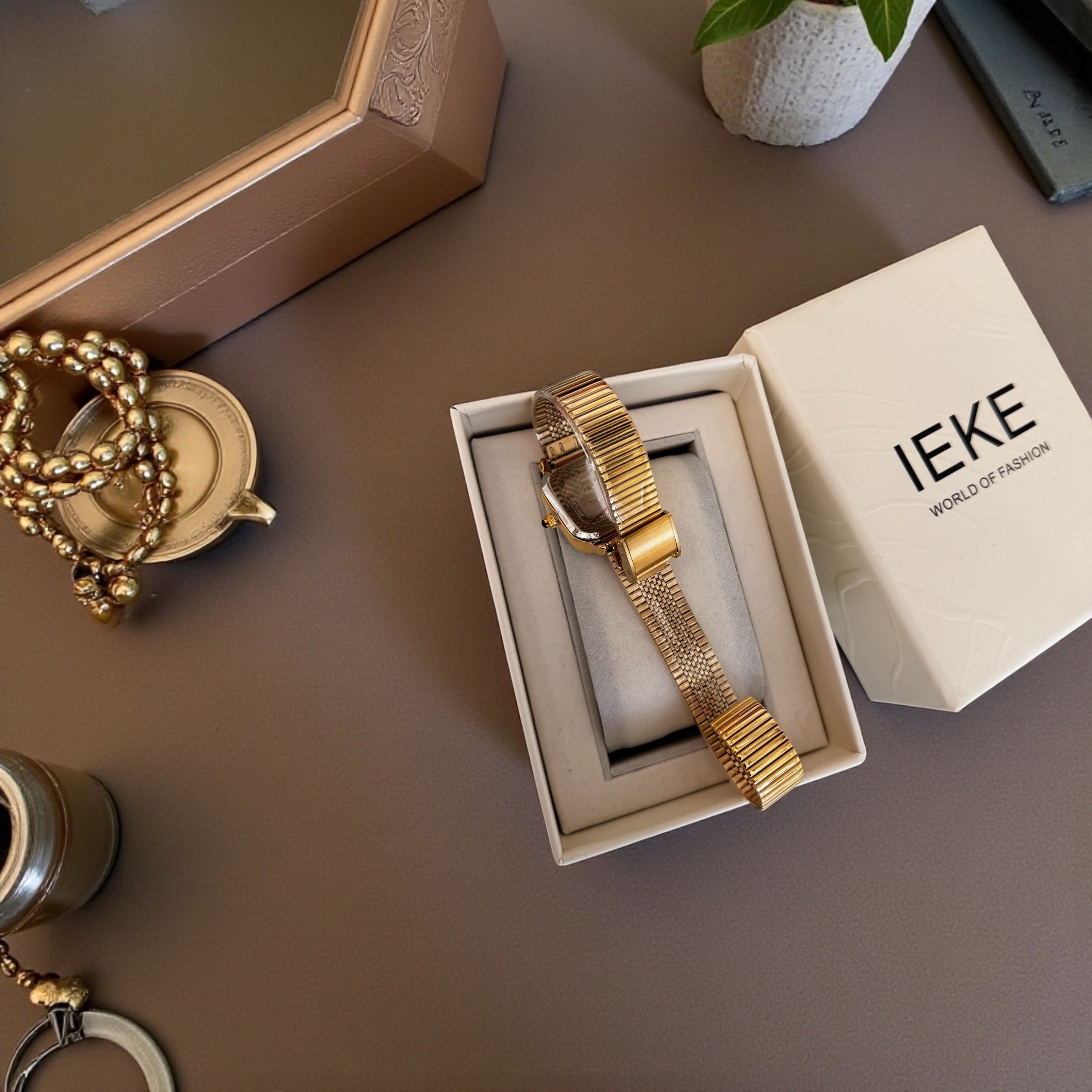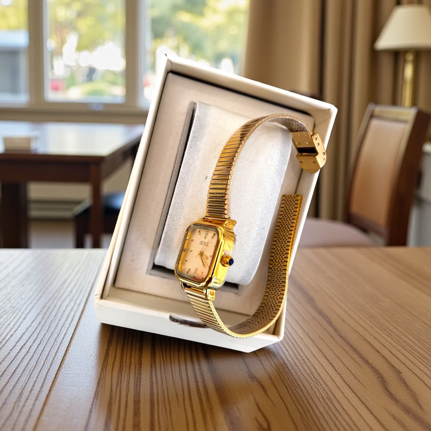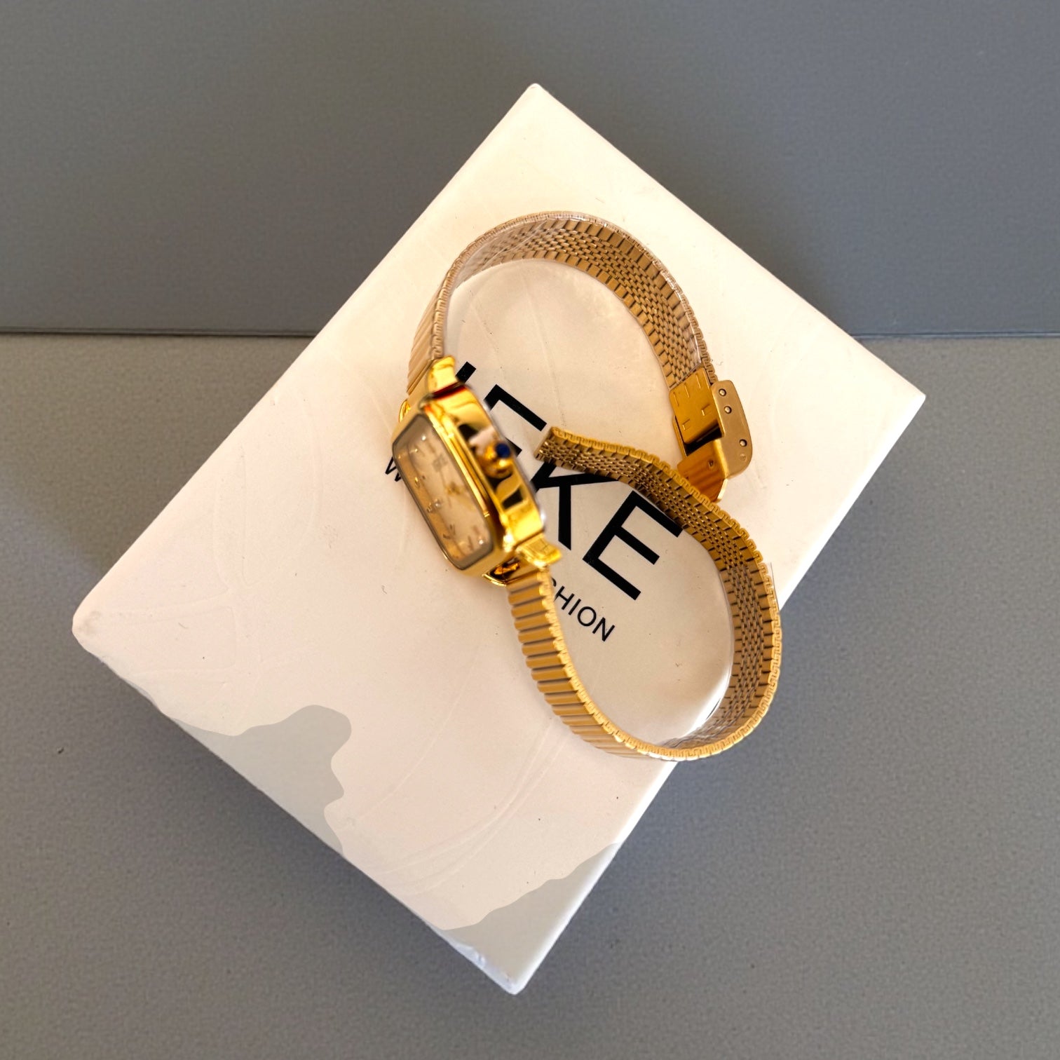 Avec son boîtier carré doré et son bracelet raffiné, cette montre incarne le luxe moderne.
