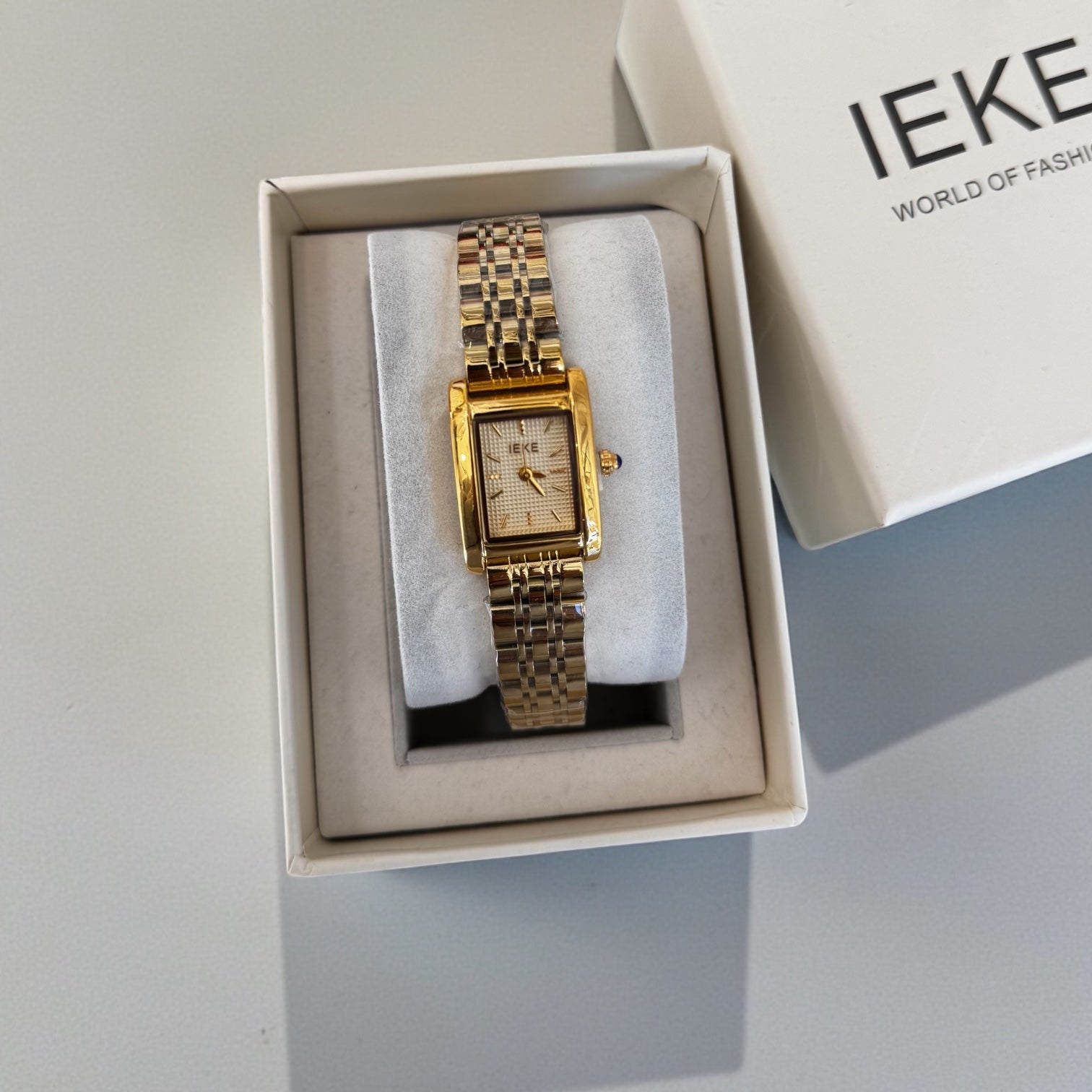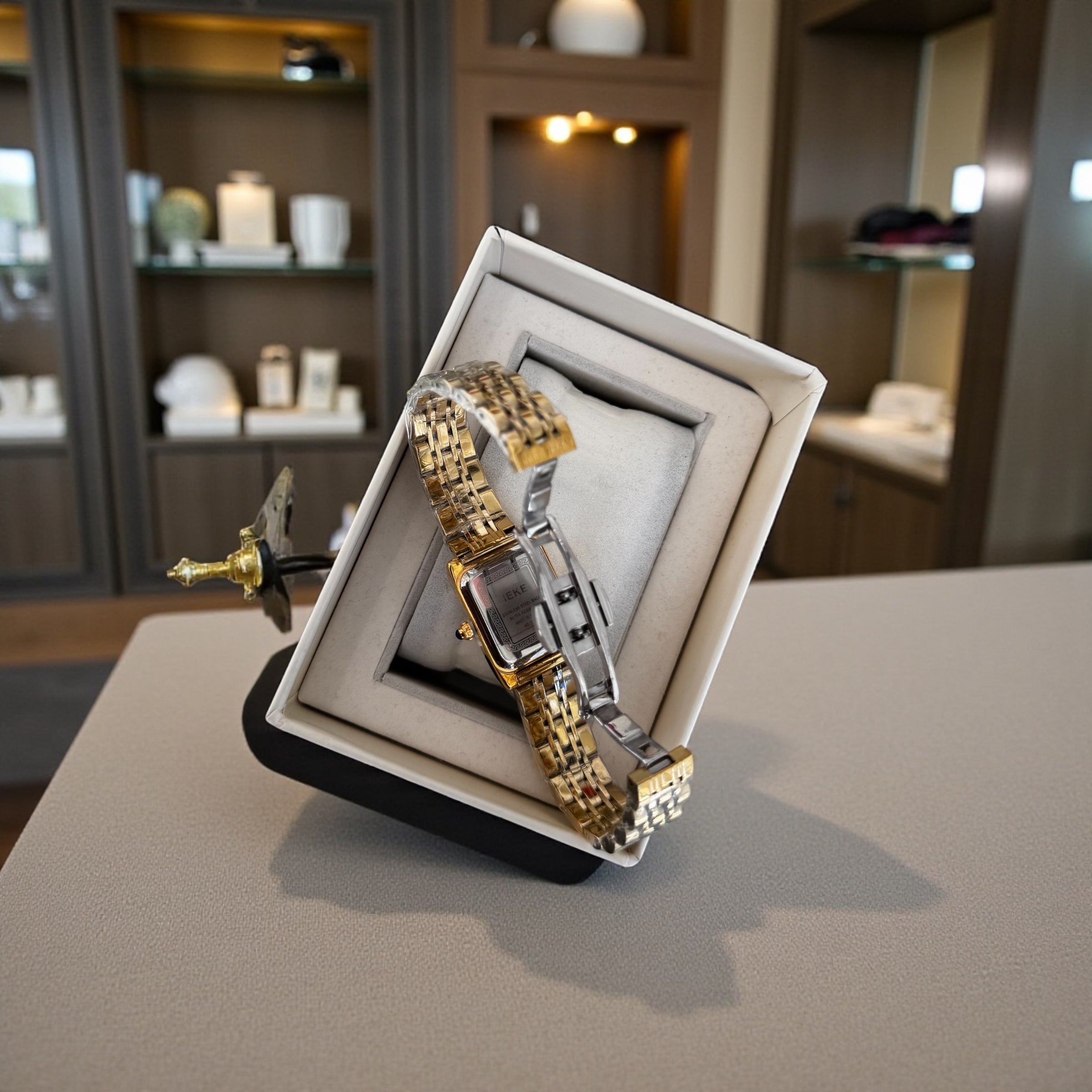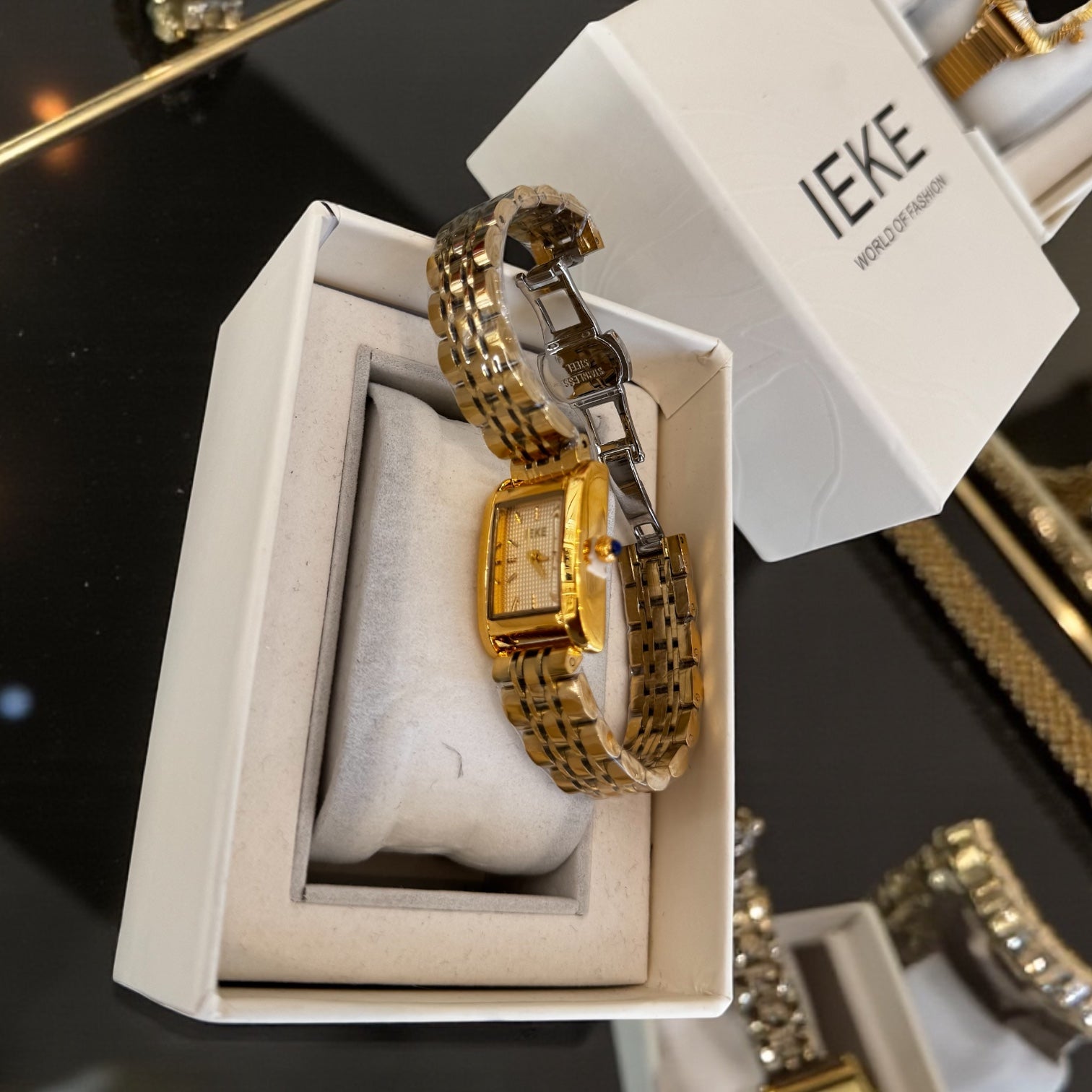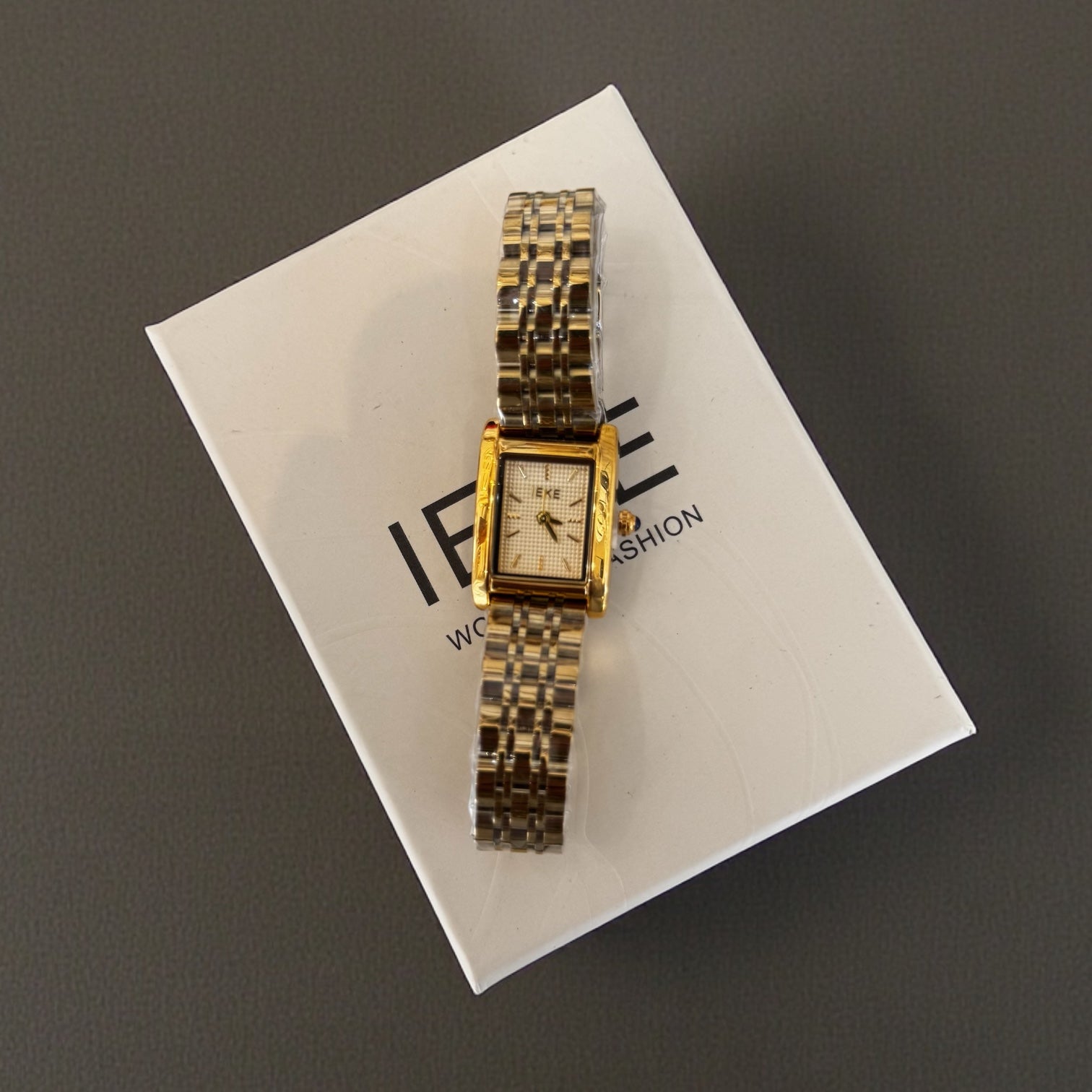 Son boîtier carré doré aux finitions brillantes se marie à merveille avec son bracelet bicolore or & argenté, pour un style à la fois sophistiqué et moderne.