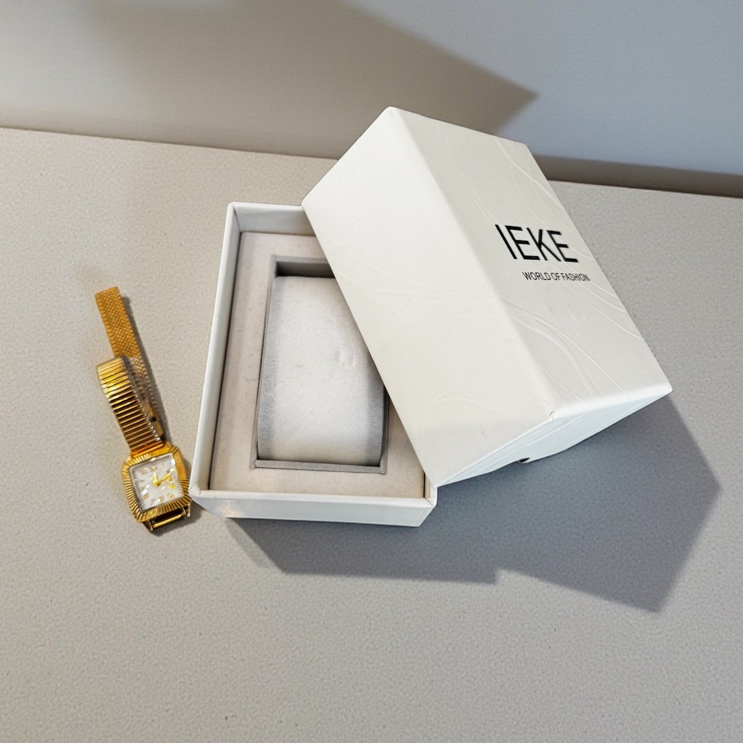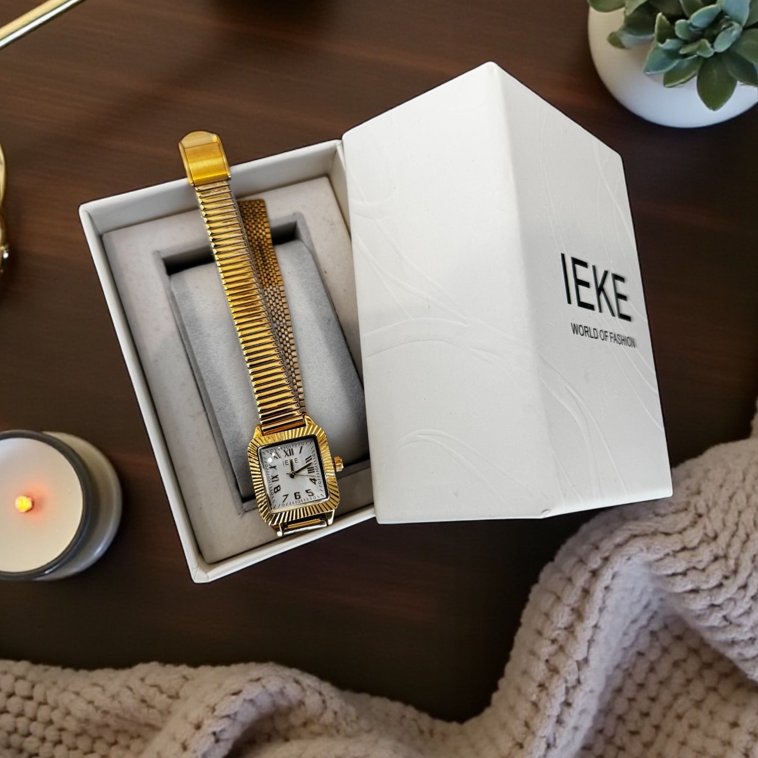Son boîtier carré doré aux détails sculptés et son cadran blanc orné de chiffres romains et arabes lui offrent un charme classique, revisité dans un esprit luxe moderne.