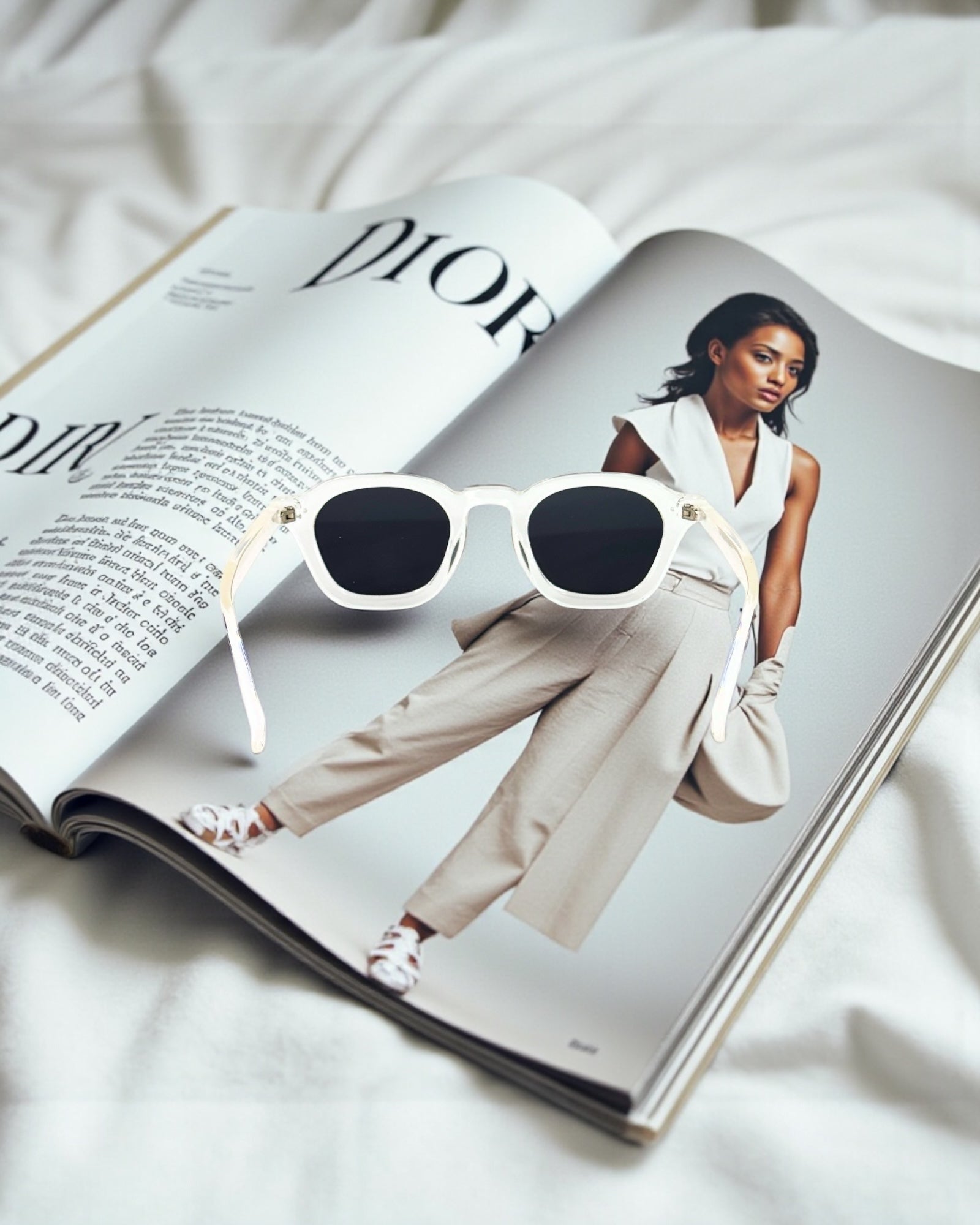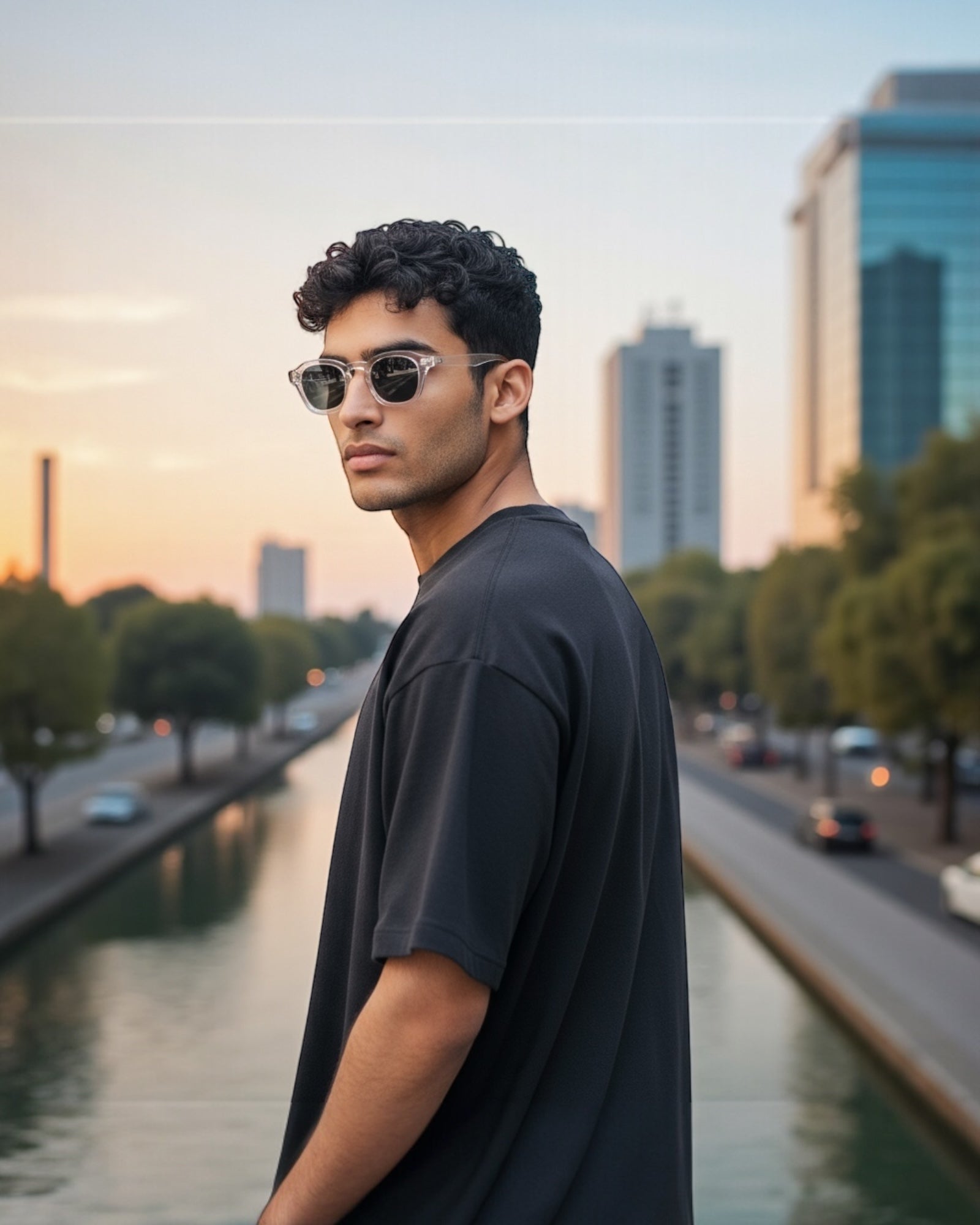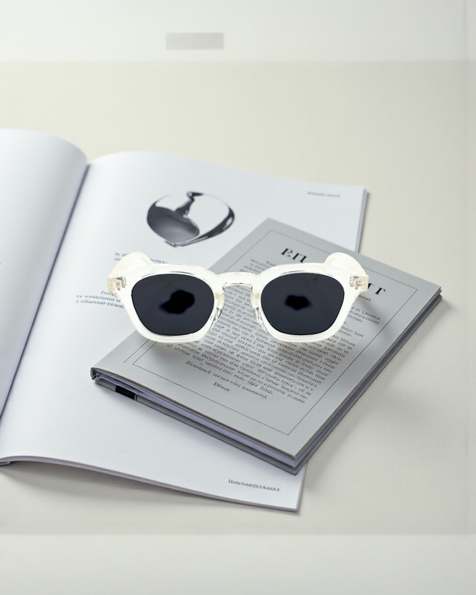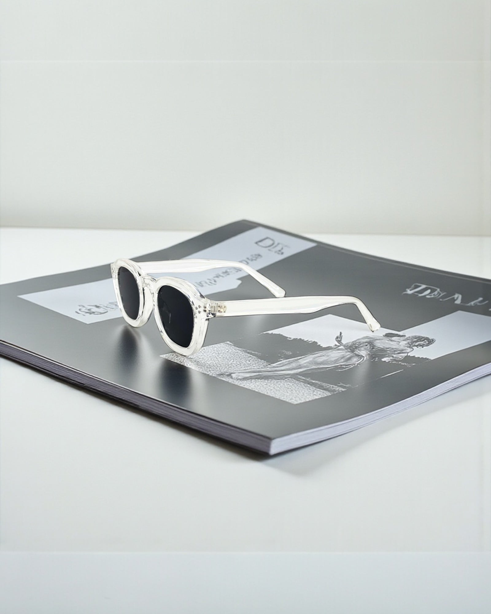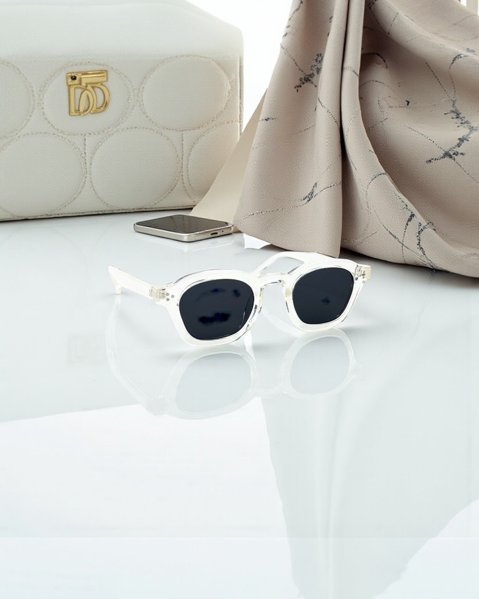 Lunettes de soleil homme à monture transparente et verres noirs profonds. Un design épuré qui incarne la sobriété et le style contemporain. Parfaites pour un look moderne et distingué en toute occasion.