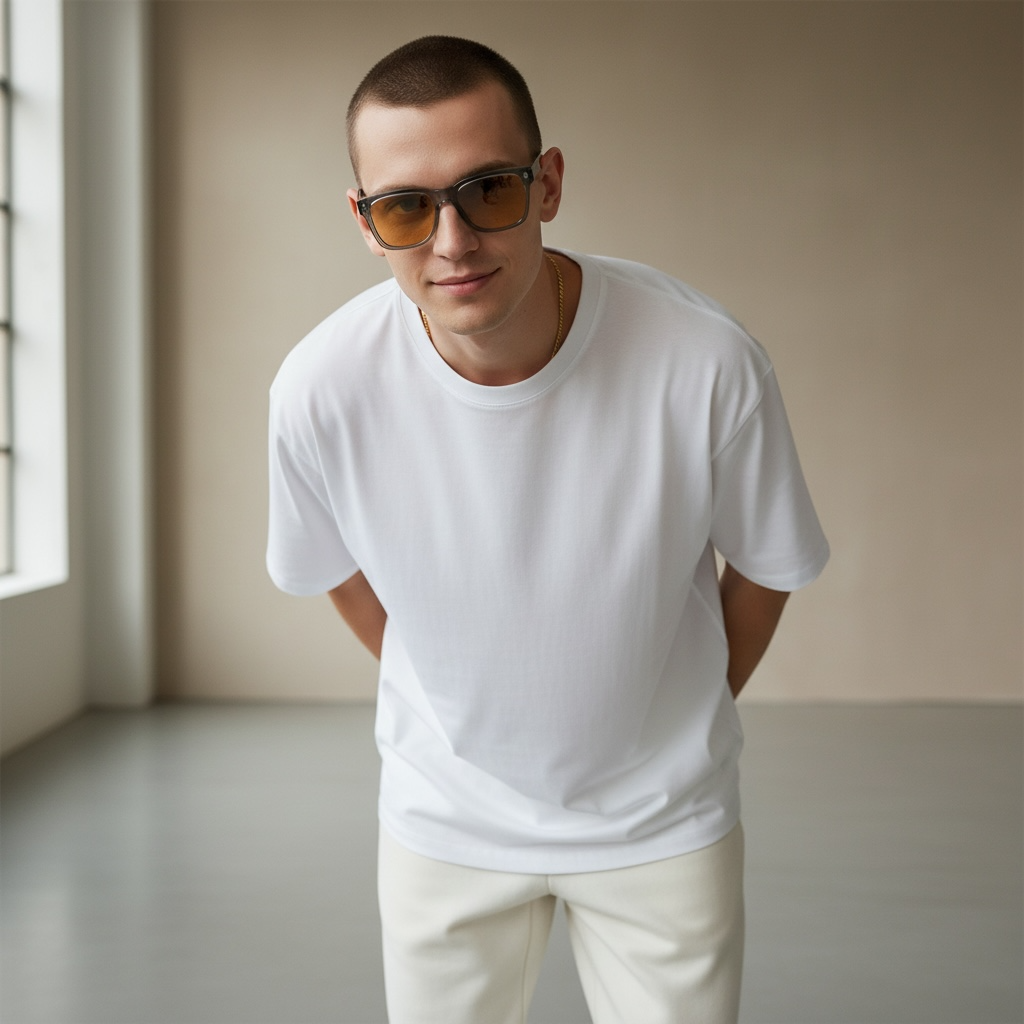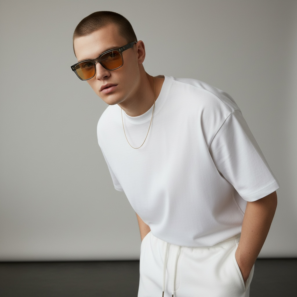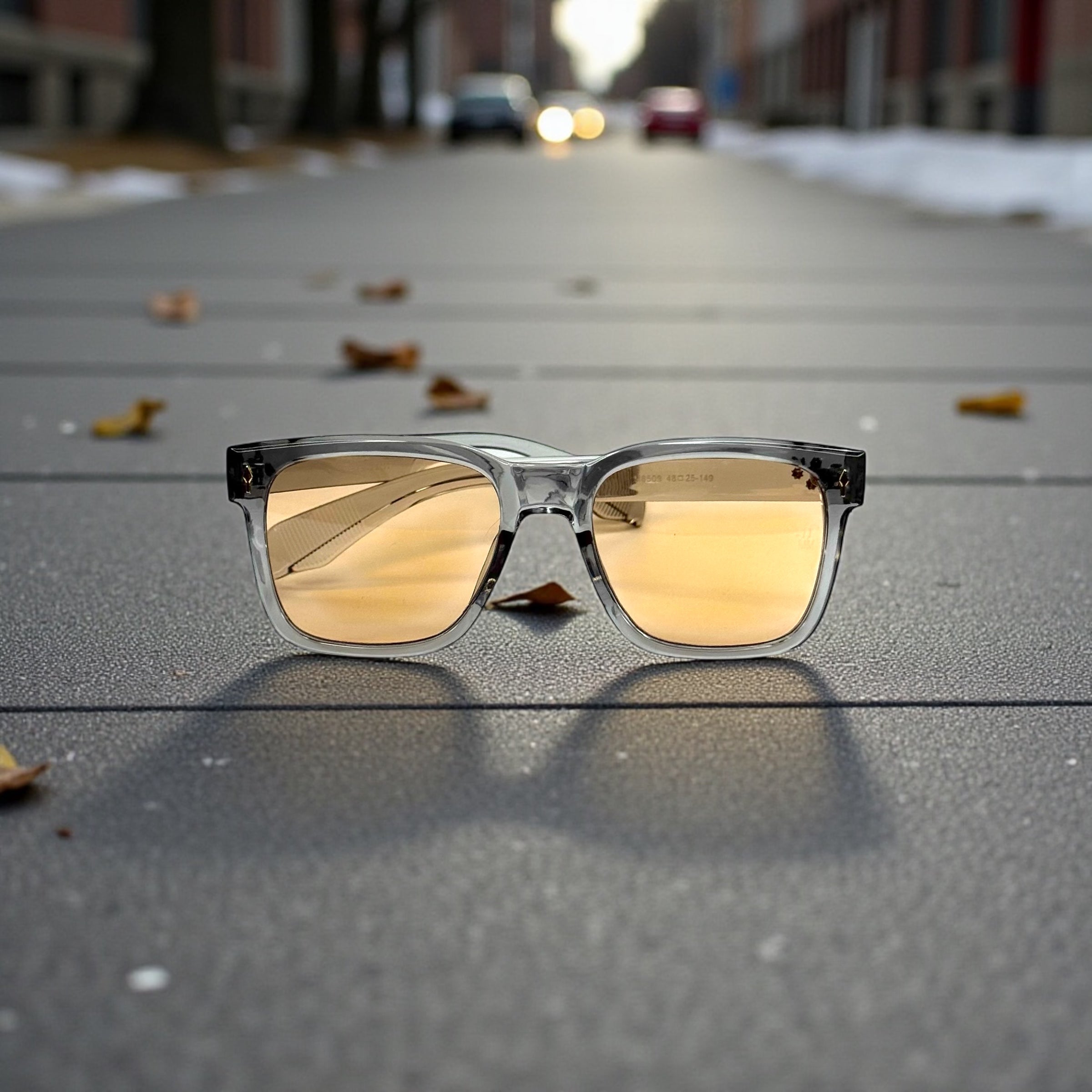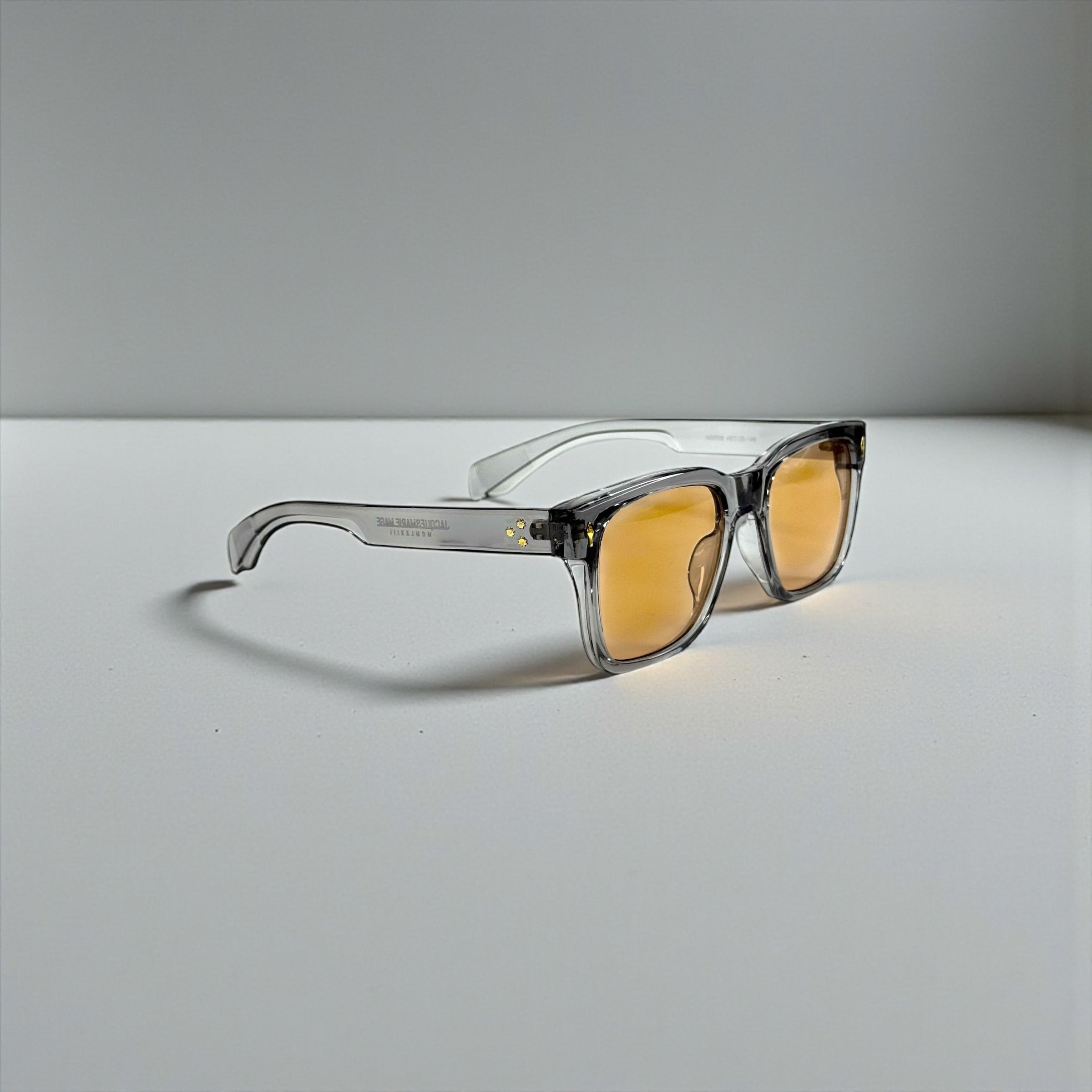 Un modèle au design épuré, doté d’une monture transparente qui capte la lumière et de verres ambrés offrant une touche chaude et raffinée. Une paire pensée pour un look urbain, minimaliste et tendance — parfaite pour sublimer chaque tenue, quel que soit le moment de la journée.