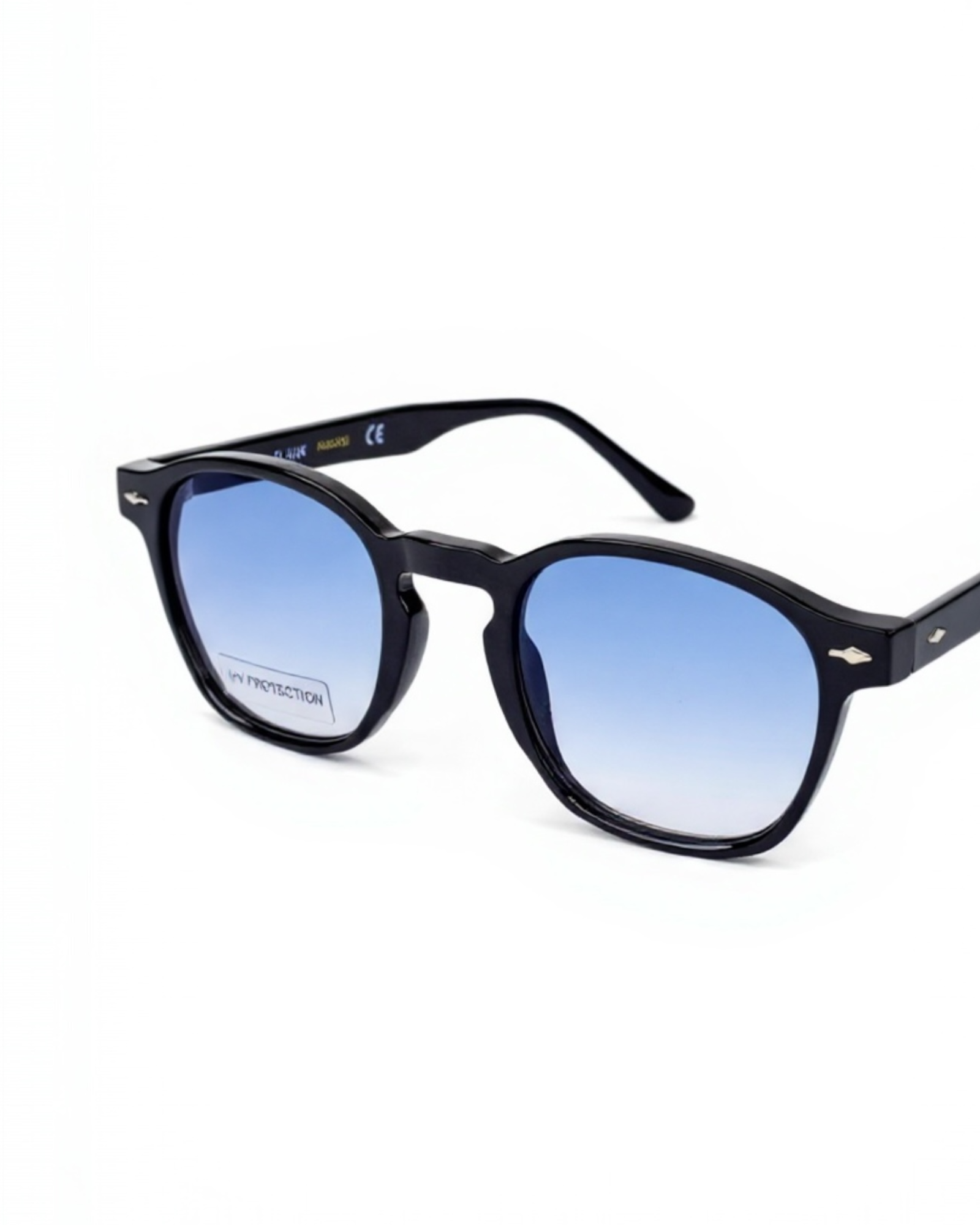 Monture noire brillante, verres bleus dégradés offrant une protection UV400 et un style à la fois classe et décontracté.