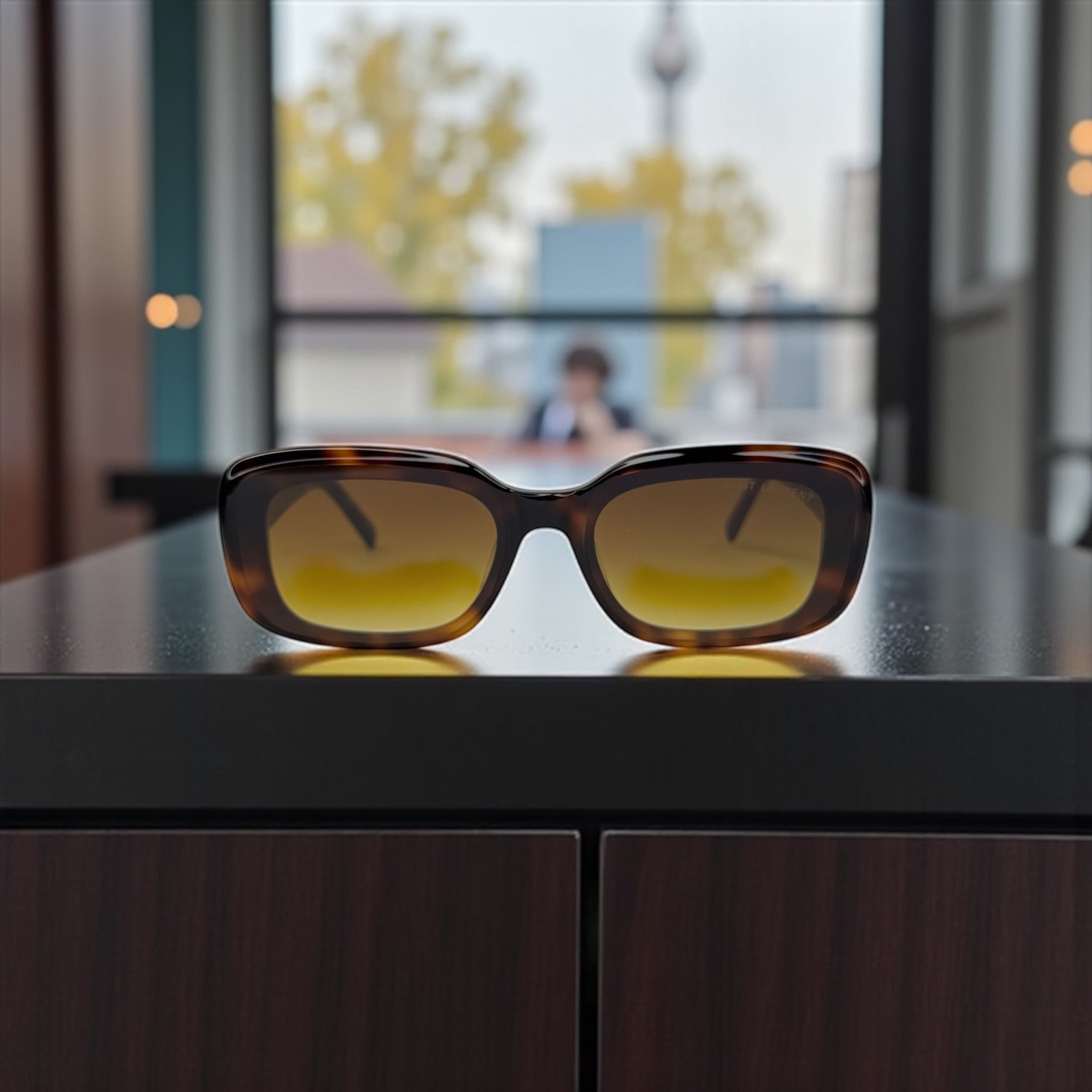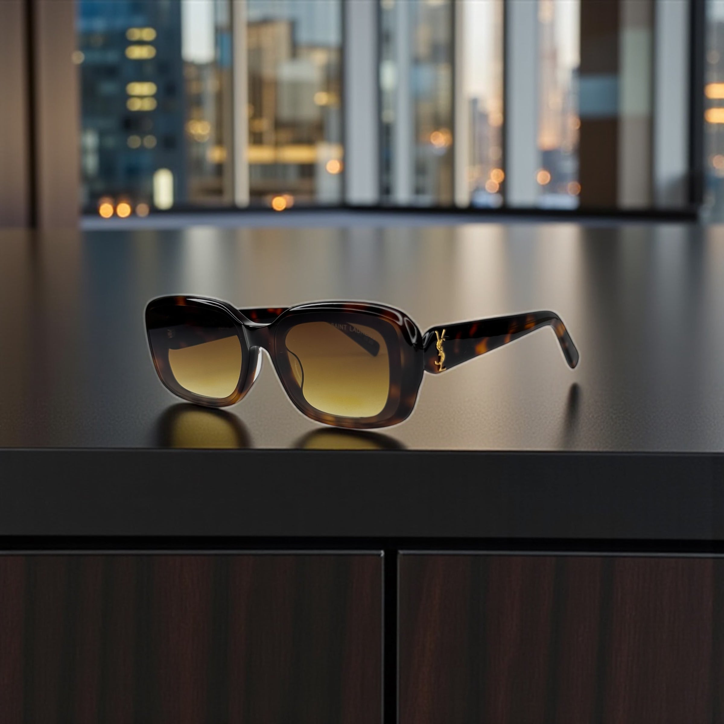 Monture carrée en acétate effet écaille, logo YSL doré sur les branches, verres dégradés marron offrant une protection UV400, allure raffinée et intemporelle.