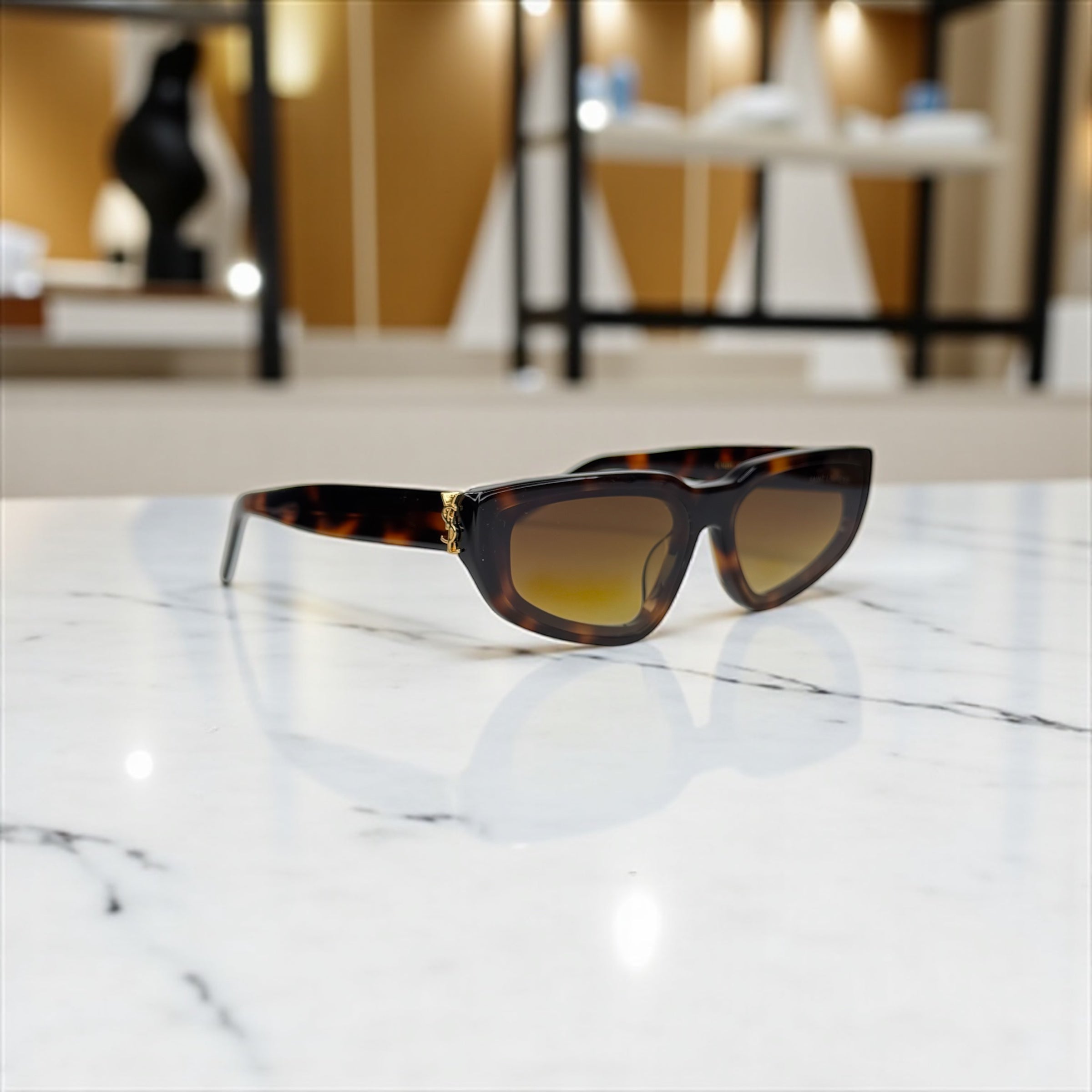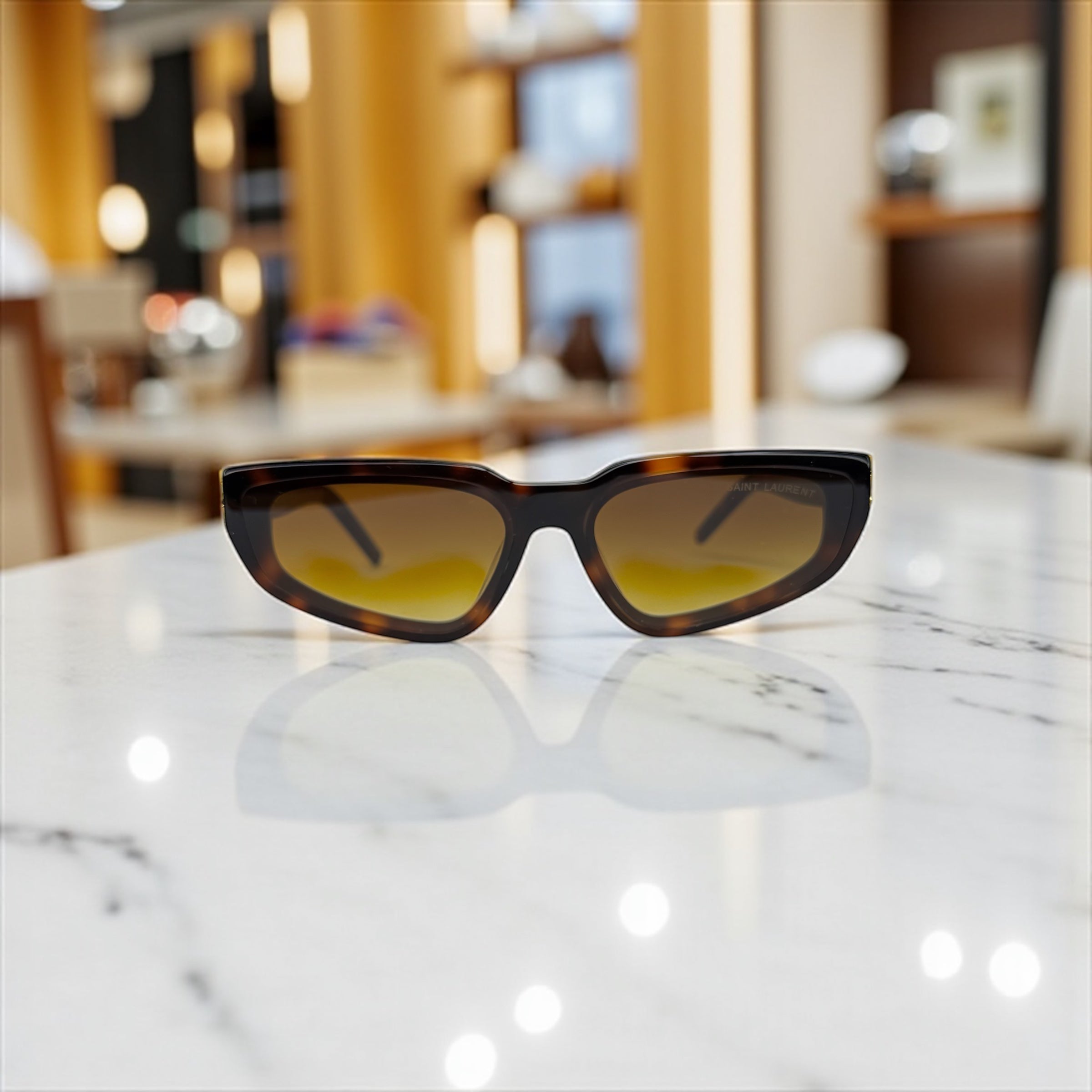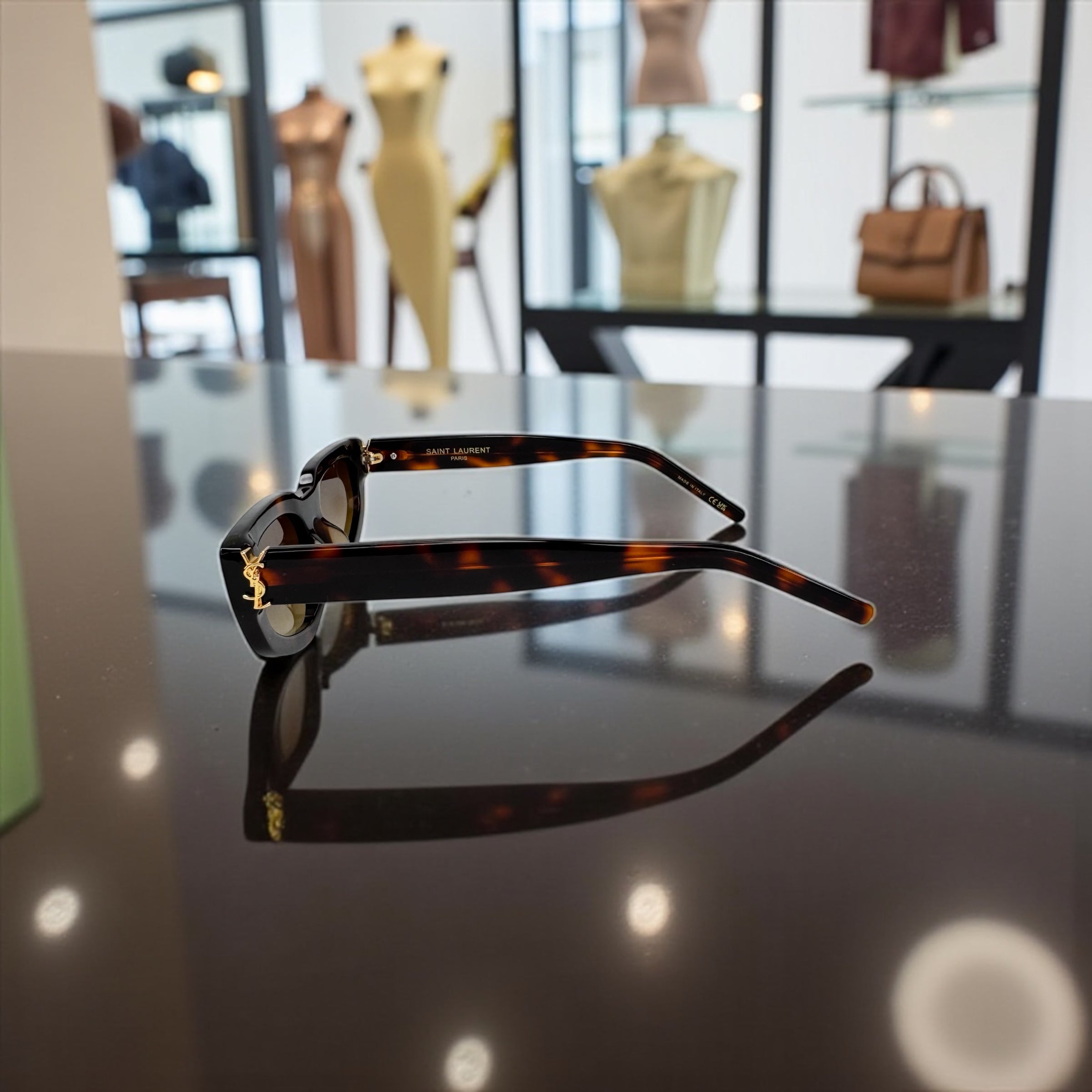 Monture cat-eye élégante et féminine, verres bruns dégradés, logo Saint Laurent discret sur les branches, protection UV400, style urbain chic parfait pour le quotidien.