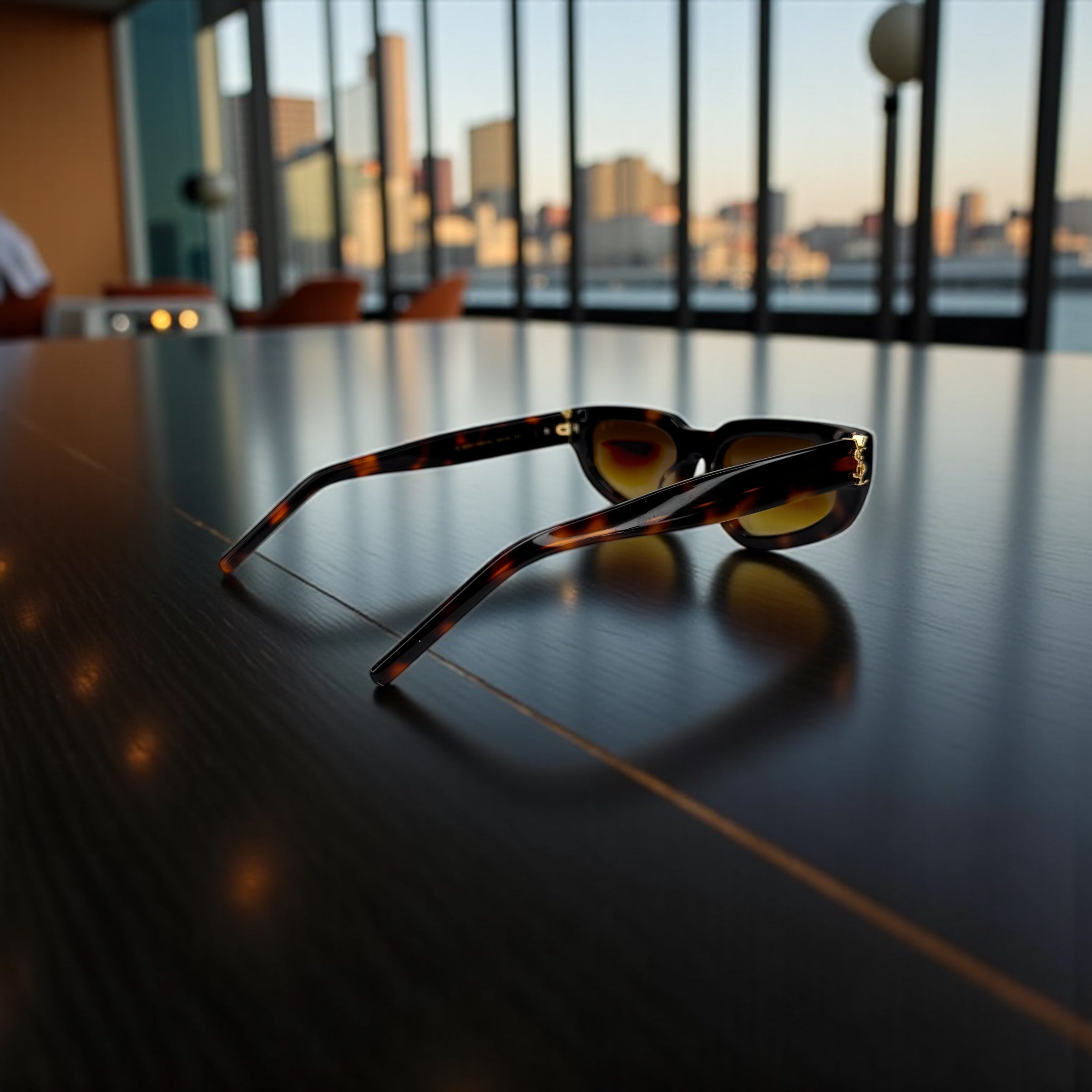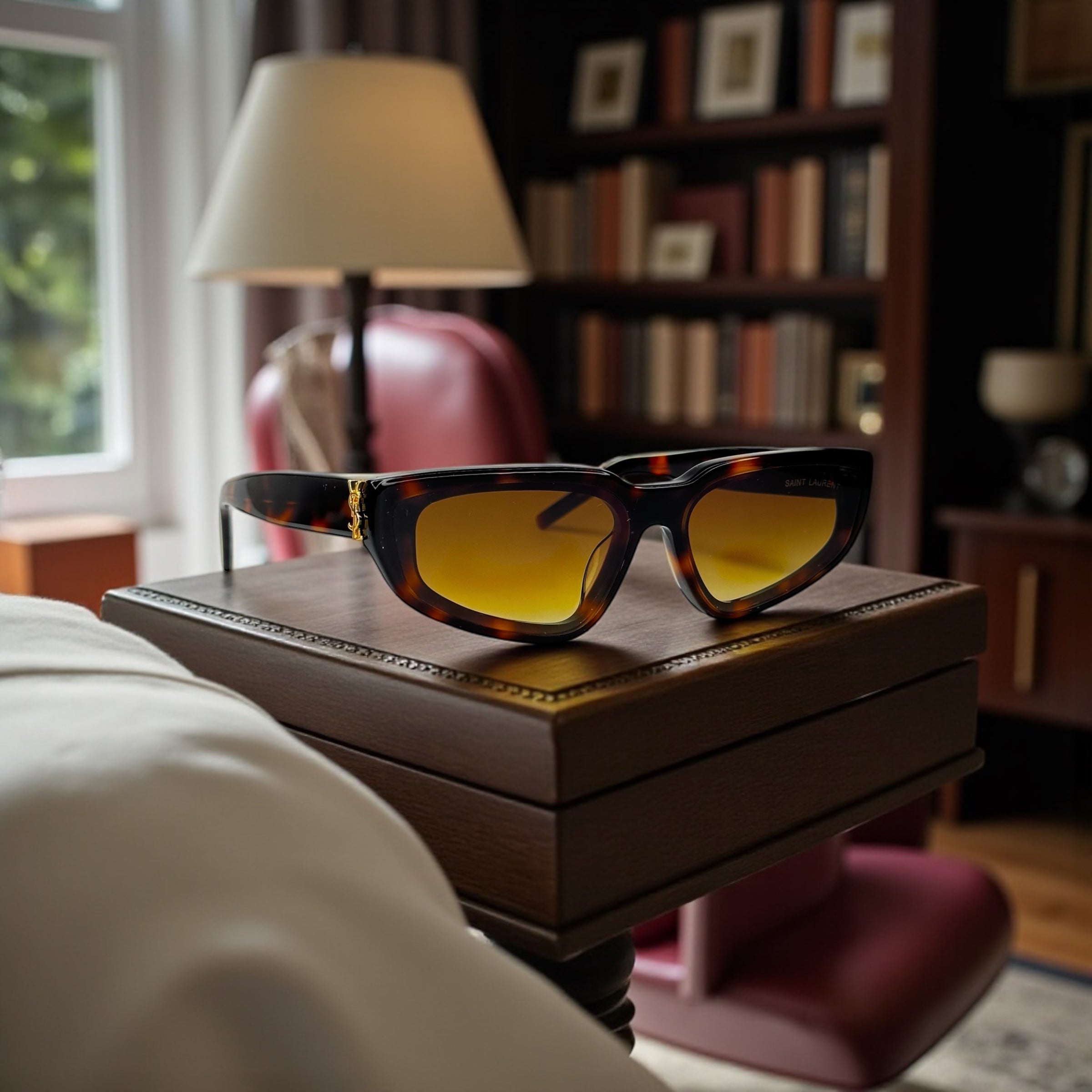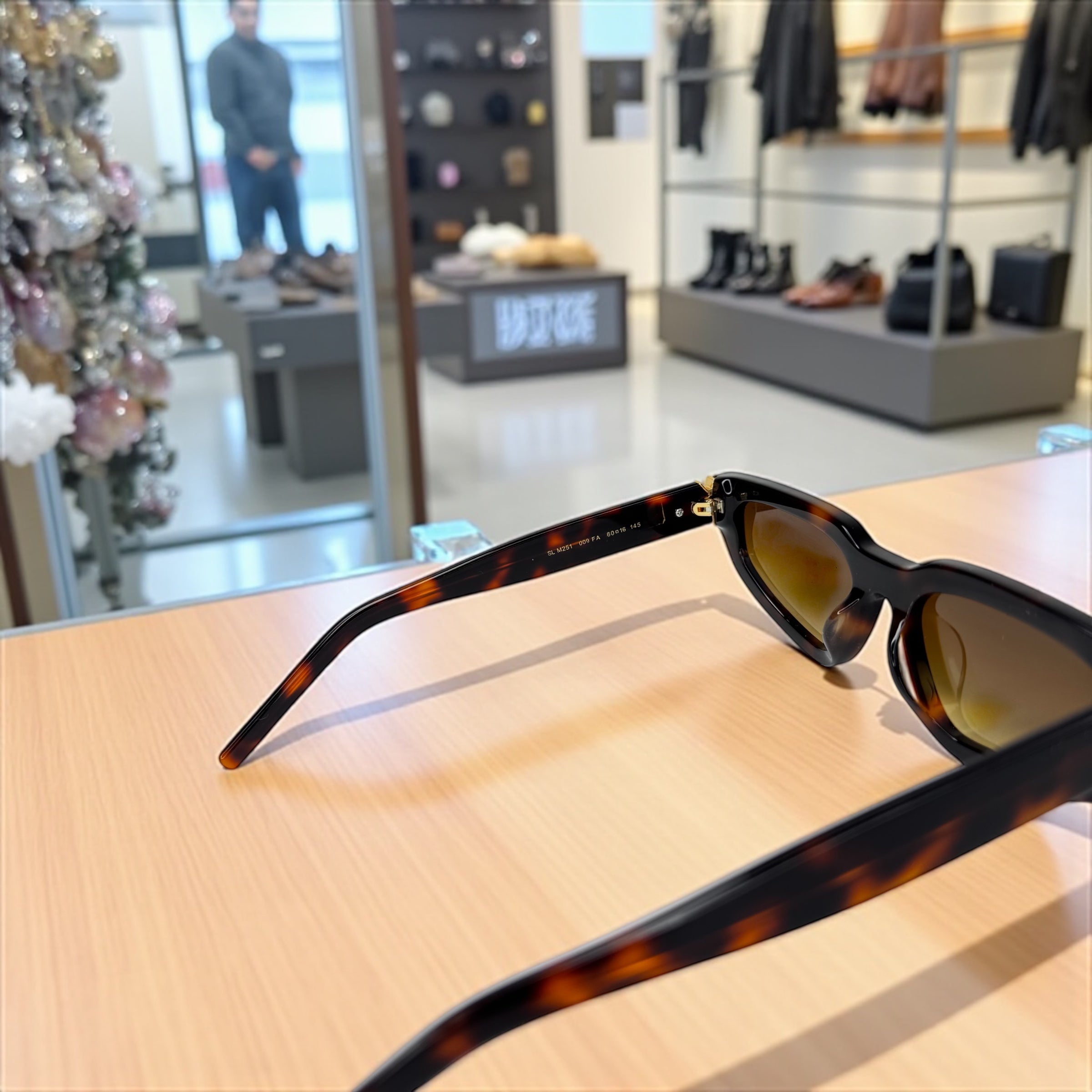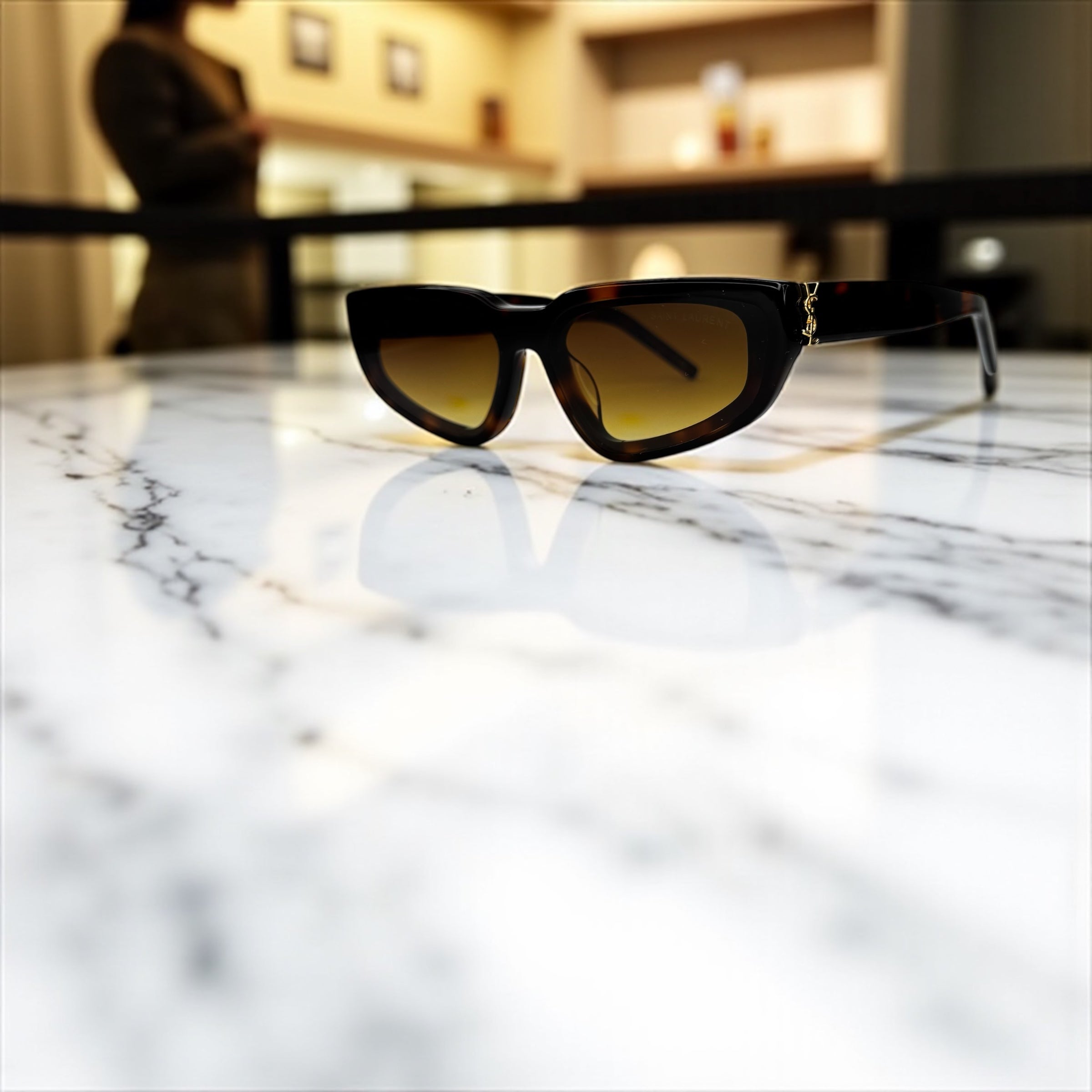 Monture cat-eye élégante et féminine, verres bruns dégradés, logo Saint Laurent discret sur les branches, protection UV400, style urbain chic parfait pour le quotidien.