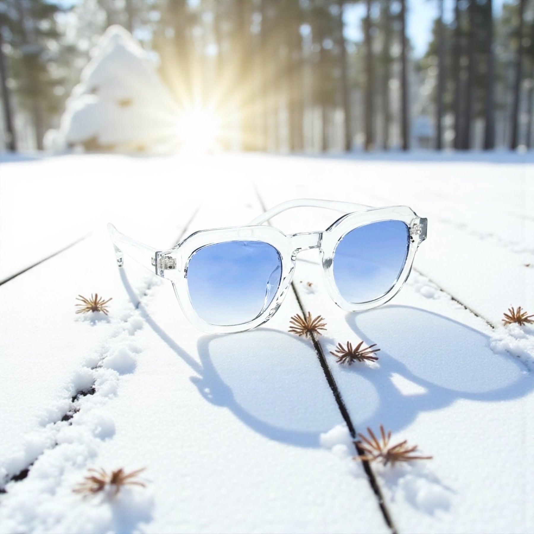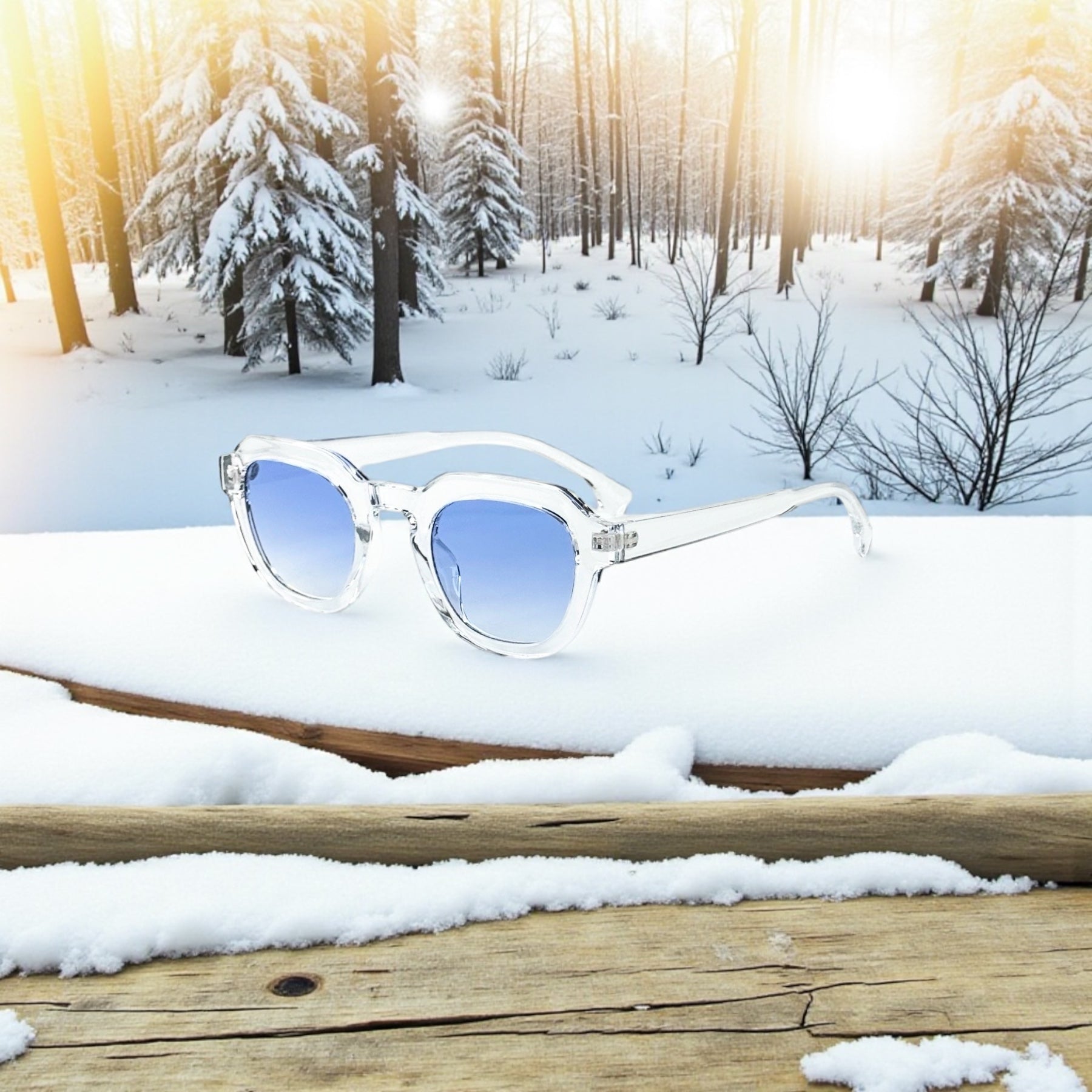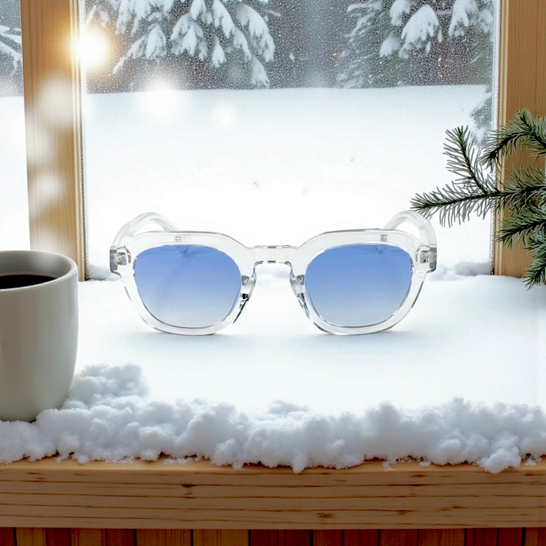 Monture transparente en acétate de haute qualité et verres dégradés bleu clair offrant une protection UV optimale.