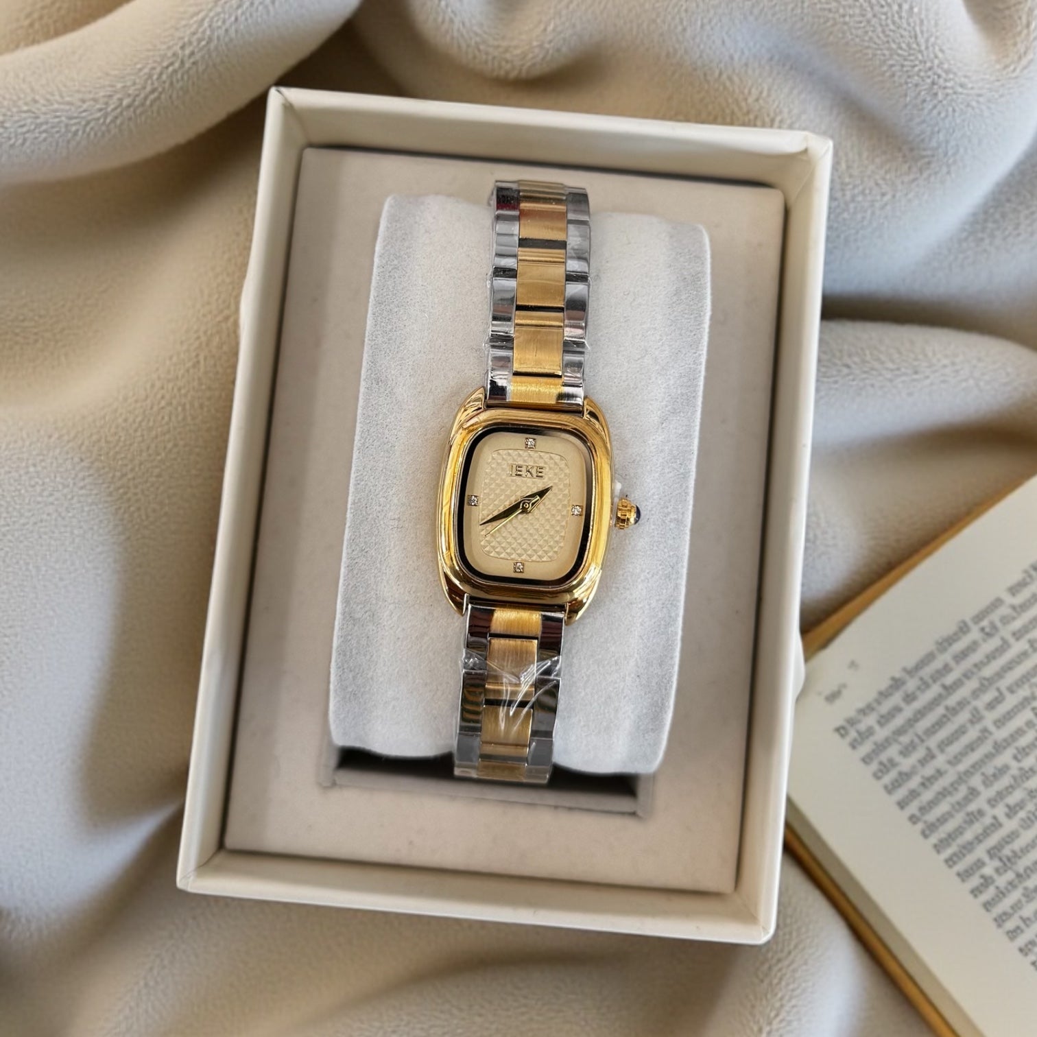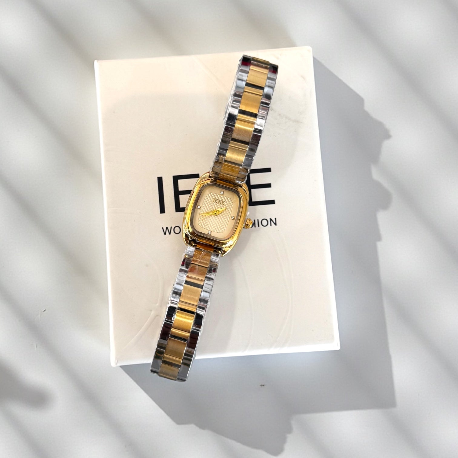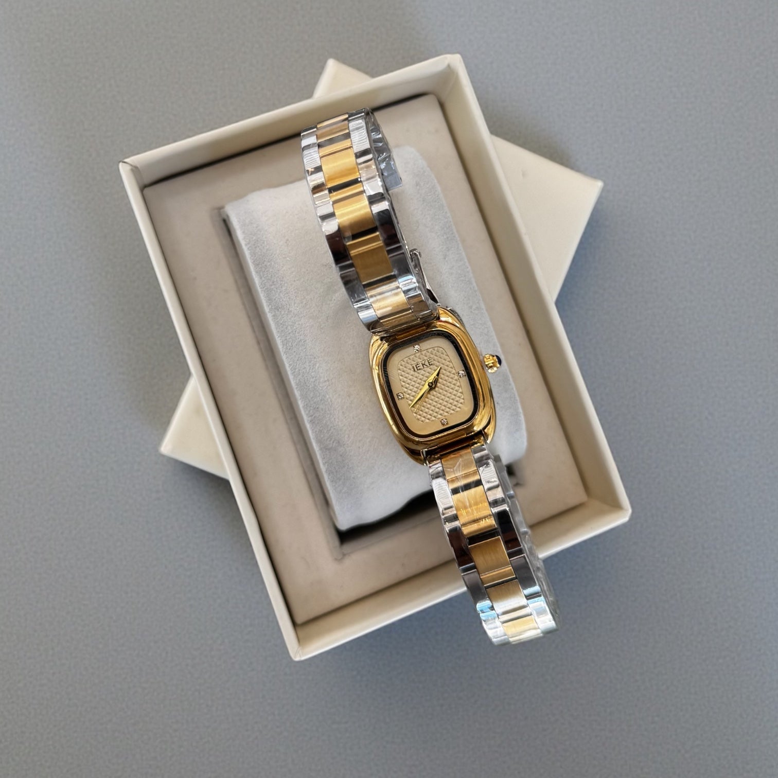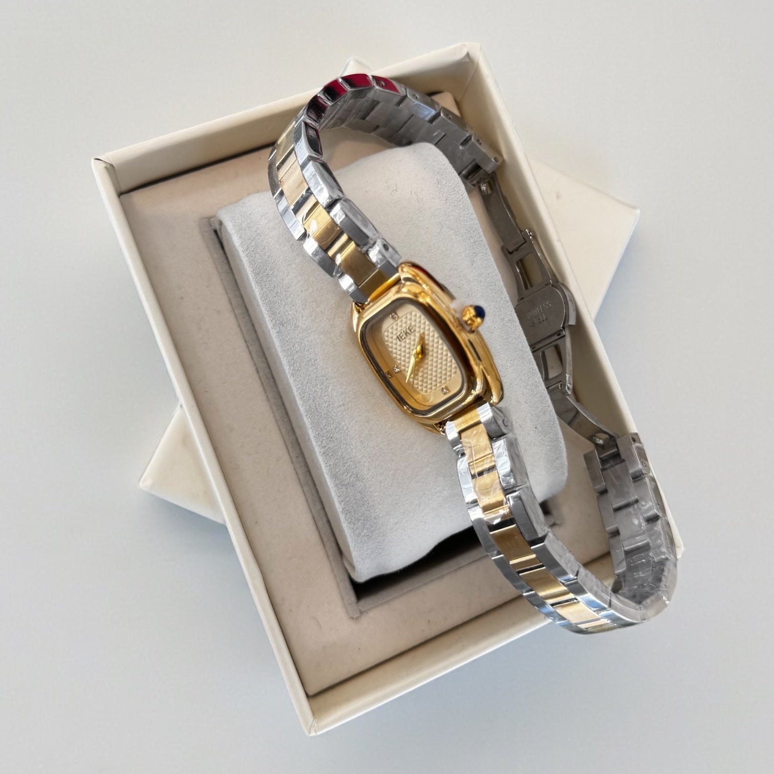 Avec son boîtier doré aux courbes raffinées et son bracelet bicolore or & argenté, cette pièce incarne un luxe discret, pensé pour les femmes au goût sûr.
