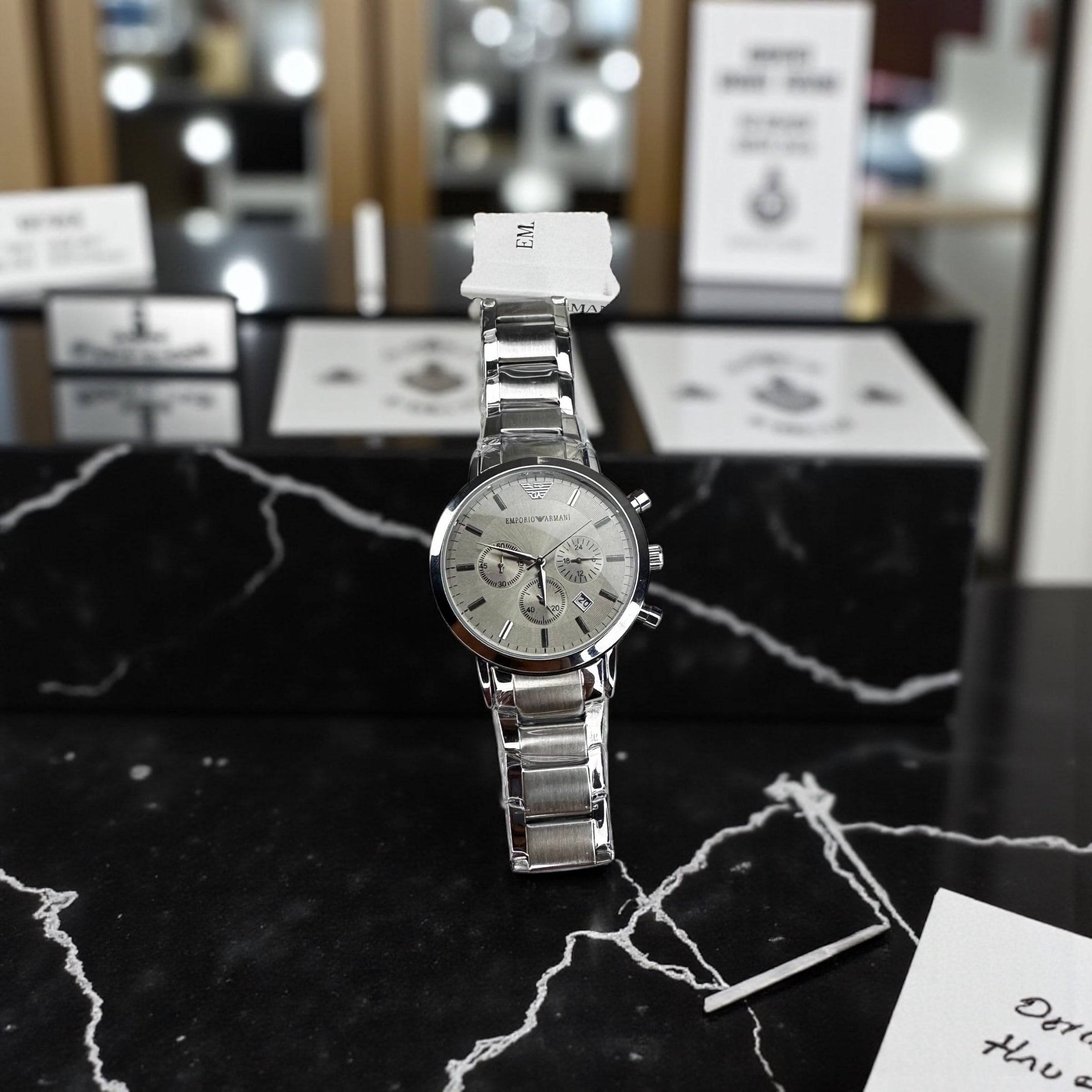 Cadran : Gris métallique avec index argentés et logo Emporio Armani à 12h
