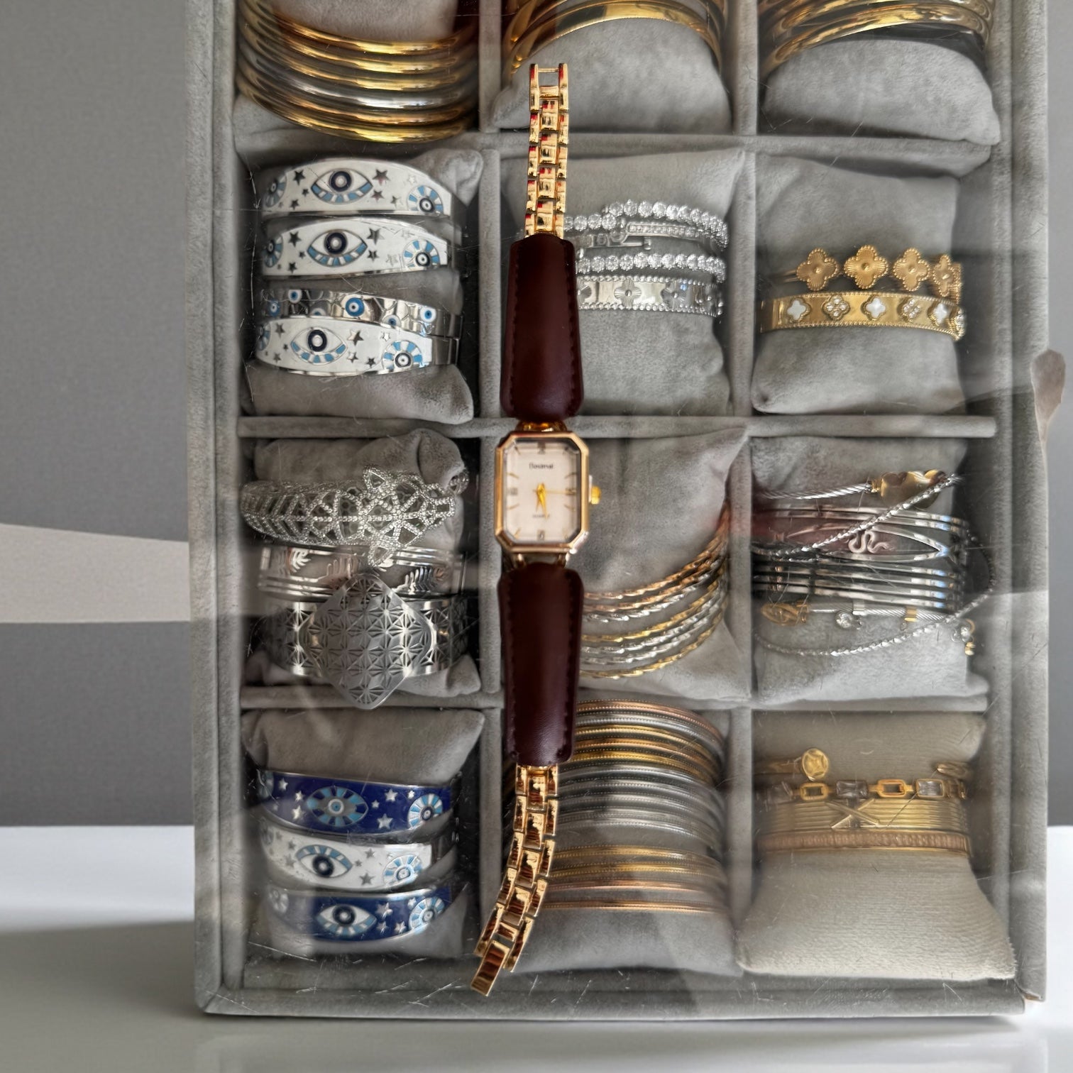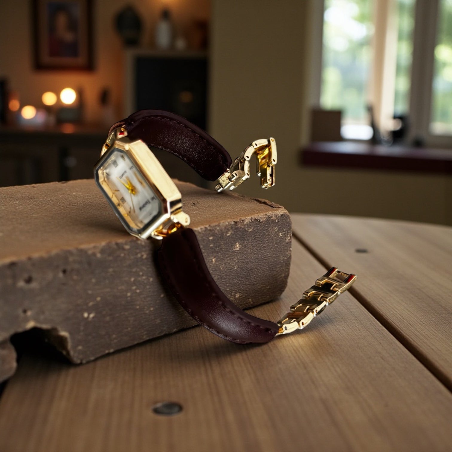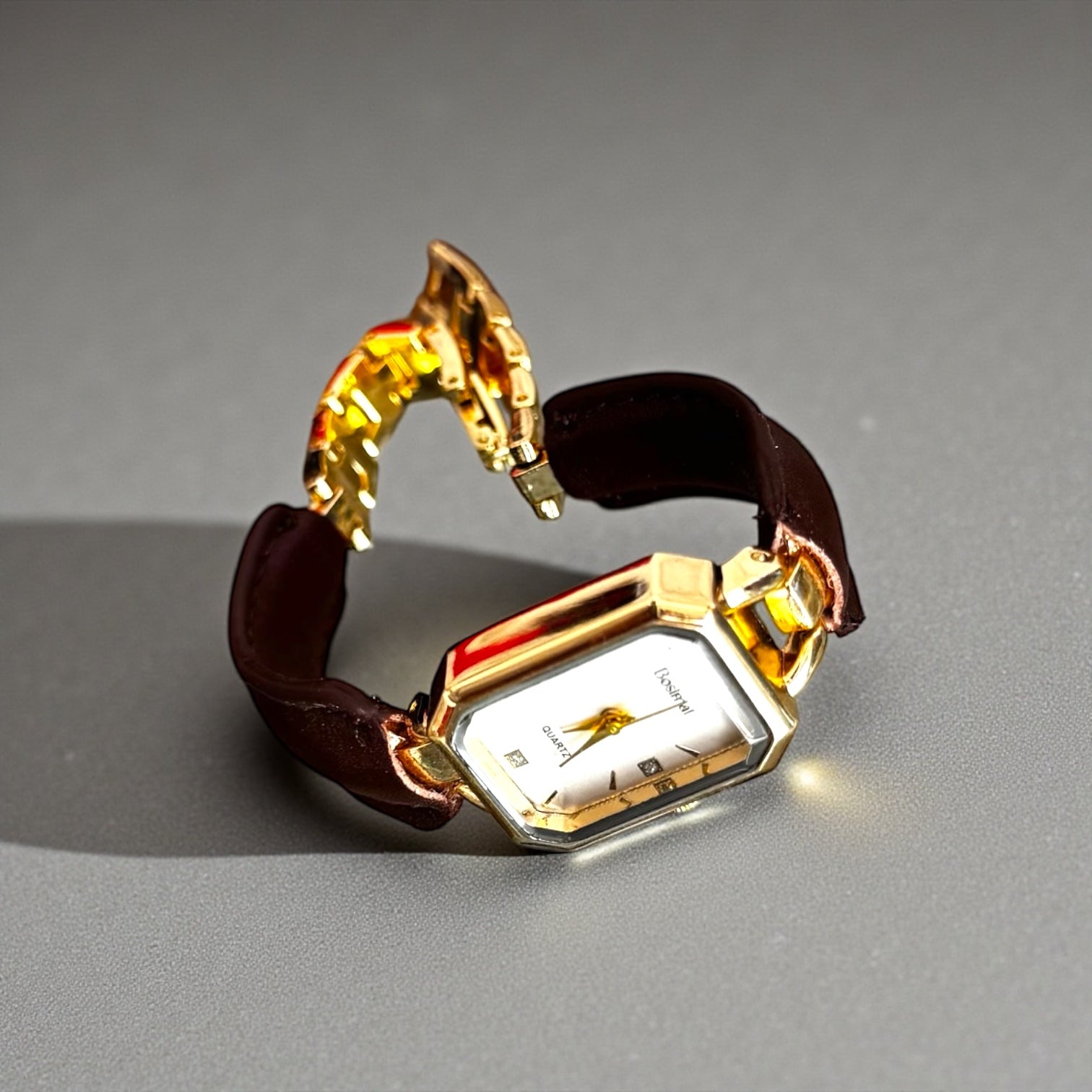 Montre femme dorée au bracelet marron élégant. Design chic et intemporel, idéale pour un style raffiné ou comme idée cadeau. Livraison rapide partout en Tunisie.