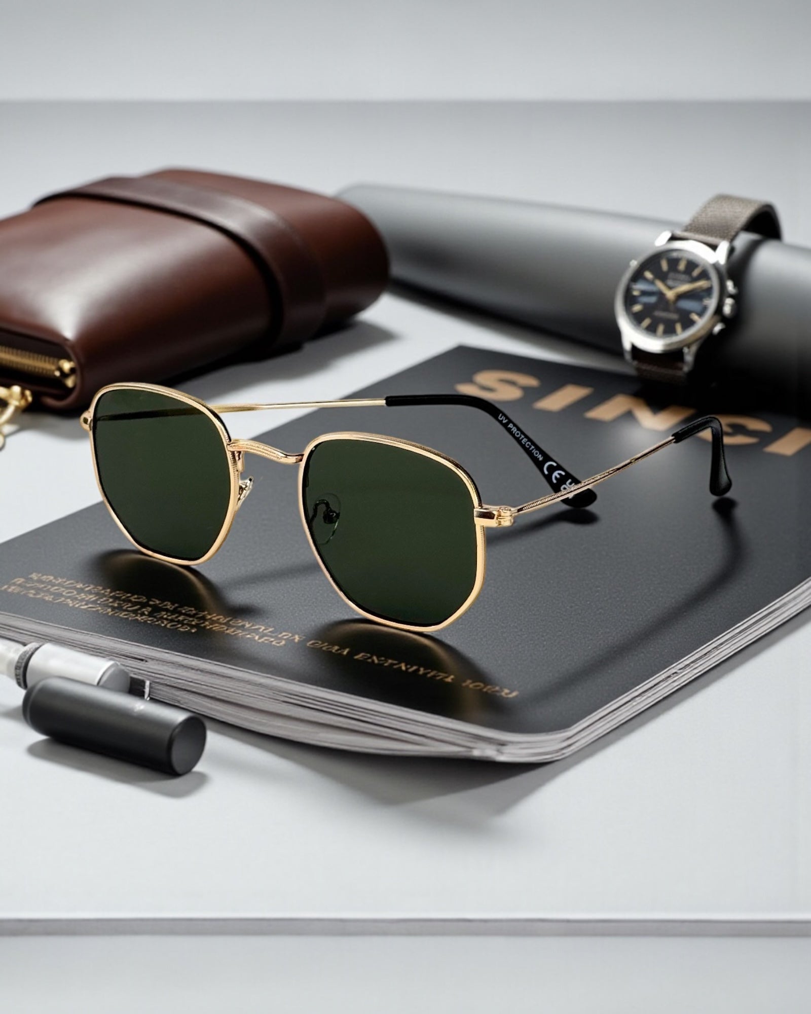 Monture fine dorée, verres verts G15 — l’accessoire idéal pour un style distingué et intemporel.