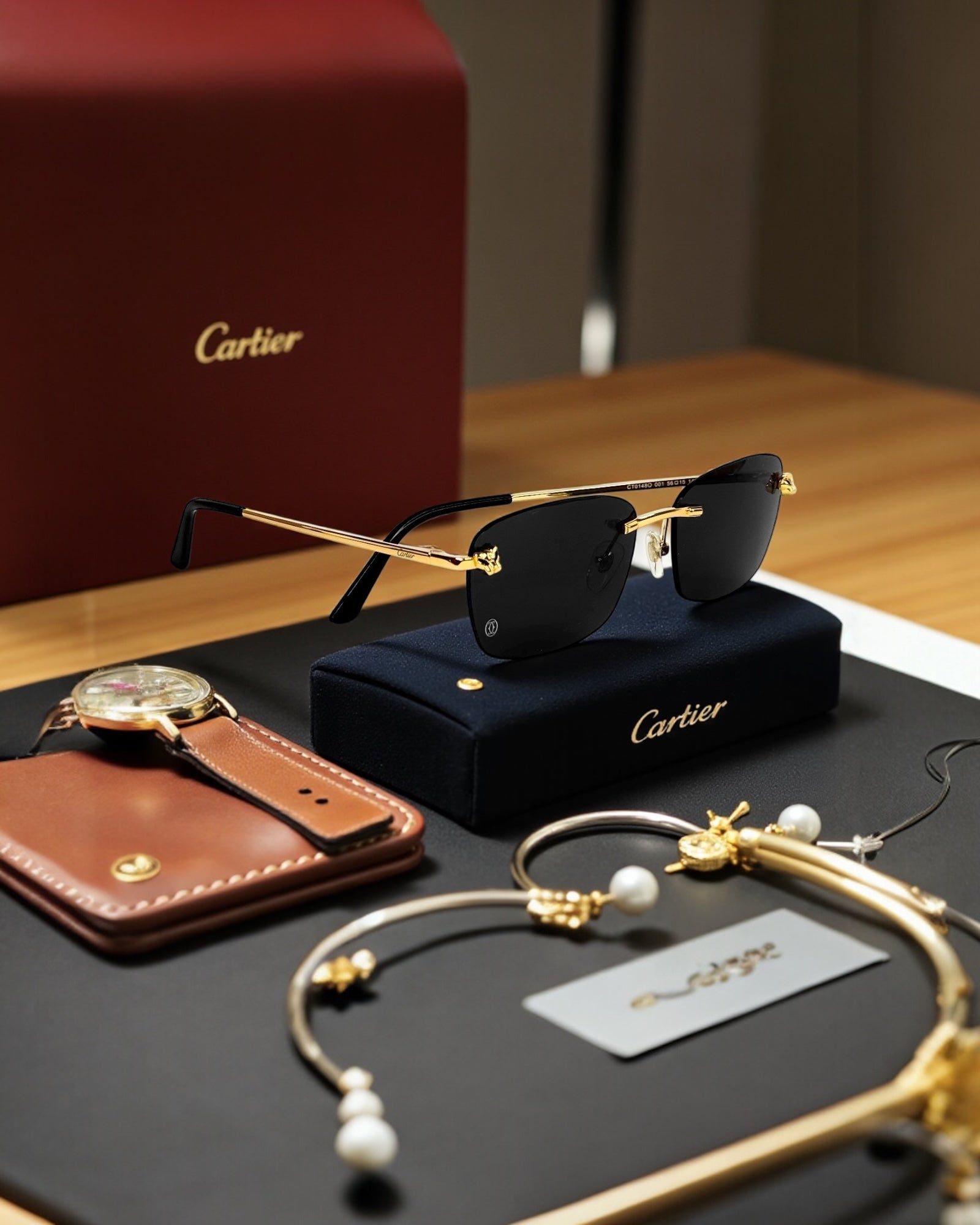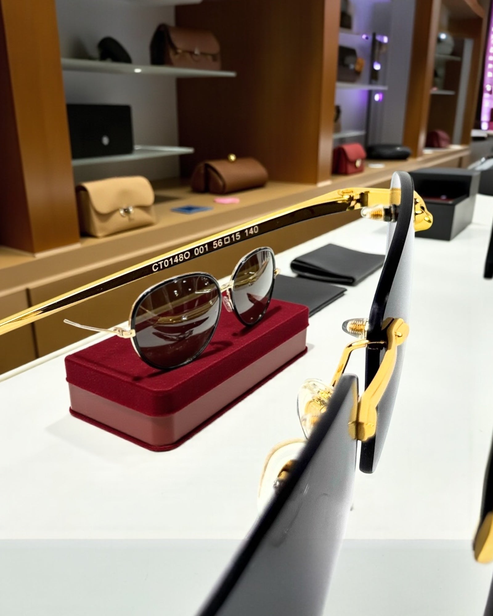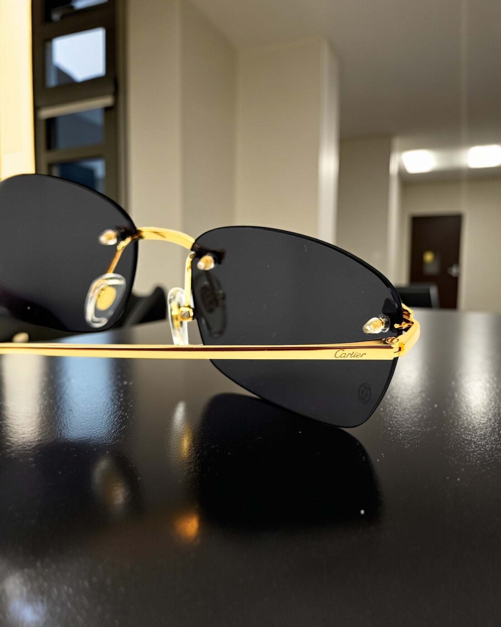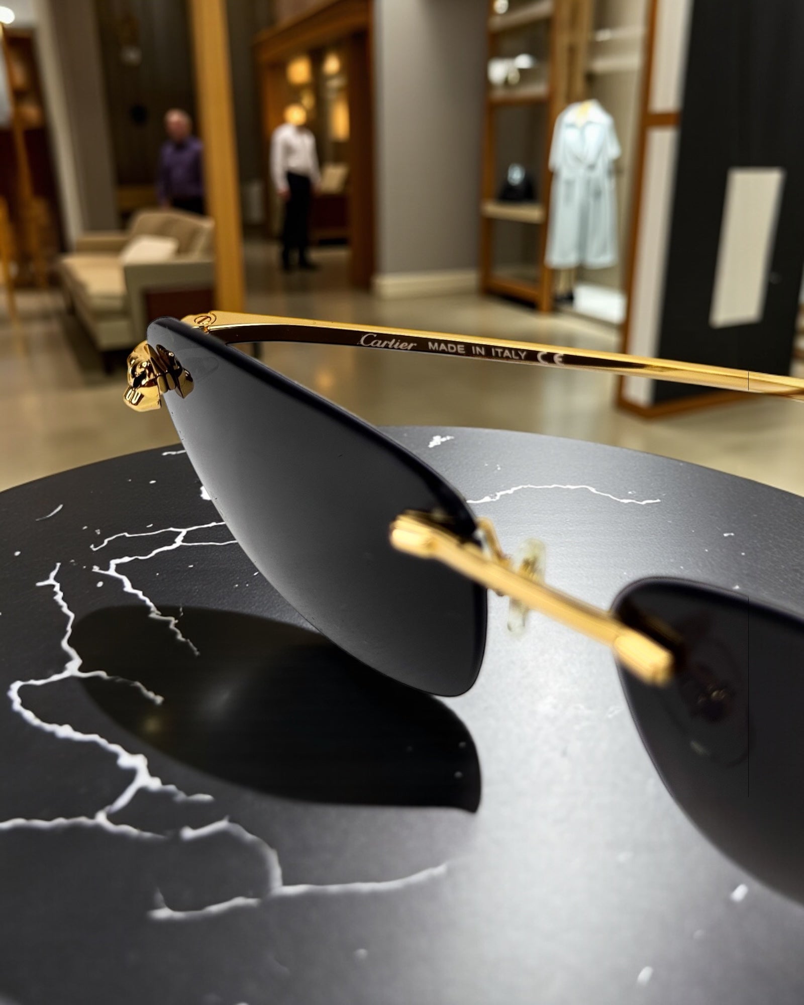 Faites la différence avec un modèle signé Cartier : monture dorée, verres noirs profonds et détails d’exception.