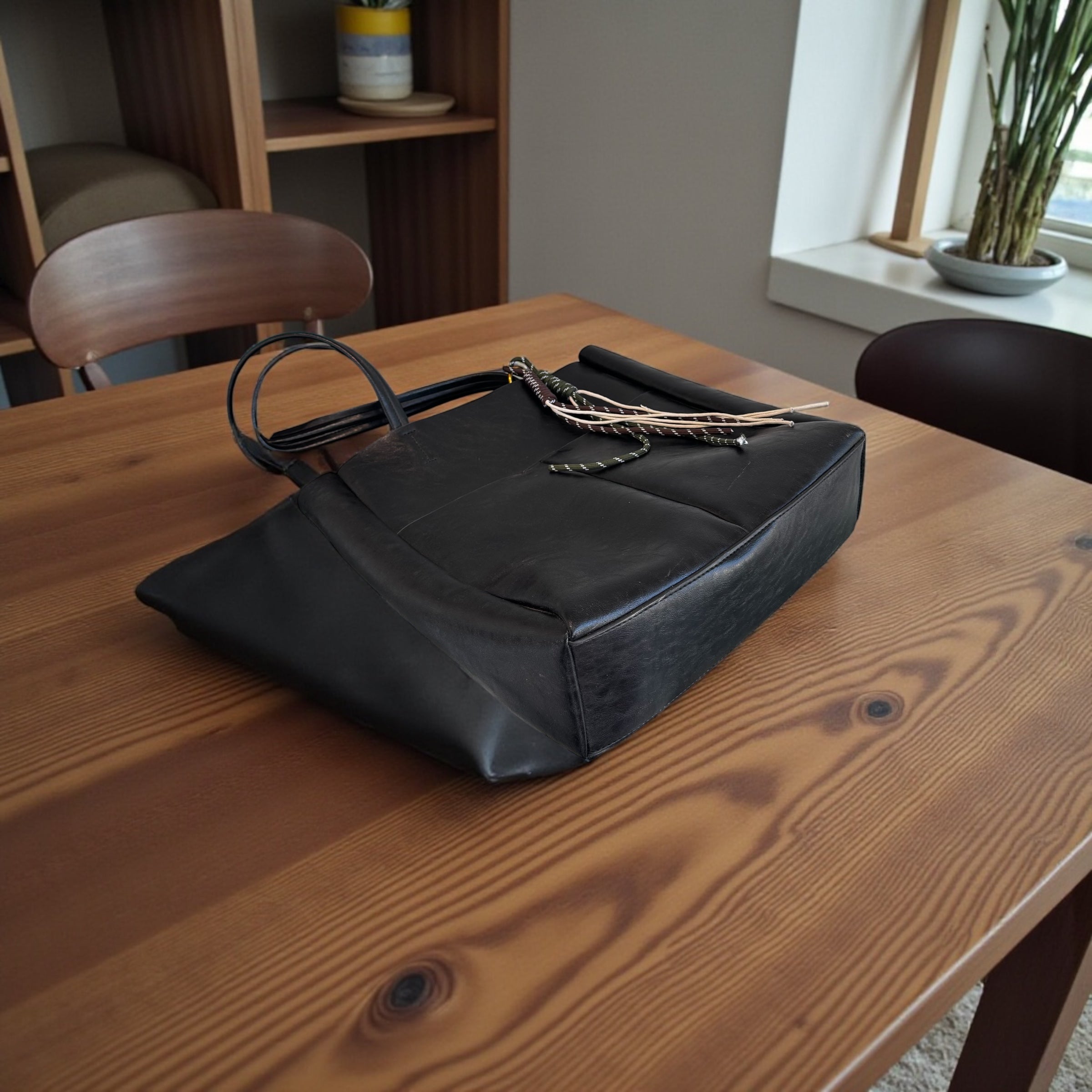 Un cabas noir à la coupe structurée, pensé pour accompagner le quotidien avec élégance.